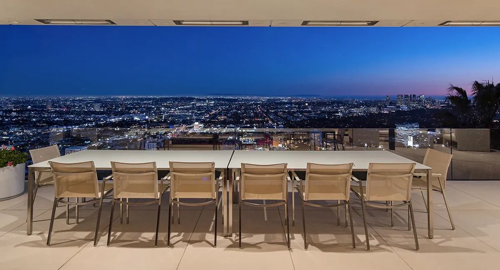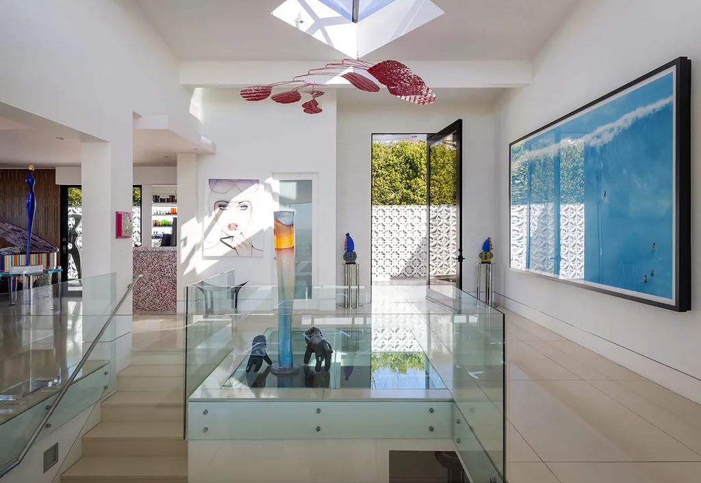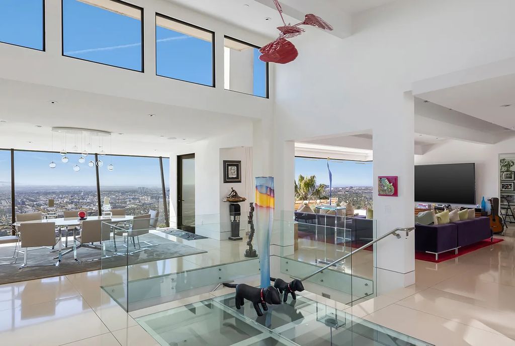 Encompassing 6,300 square feet on nearly an acre, the residence delivers panoramic city-light and Pacific Ocean vistas from virtually every room. A gated entrance with serene water features leads to an all-white façade and a three-car garage with ample guest parking. Inside, a double-height foyer with a transparent floor and floating staircase sets an immediate tone of modern drama.