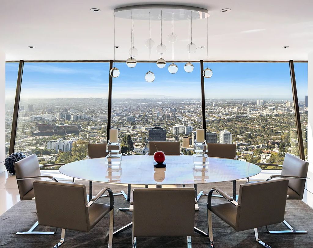 Walls of glass in the main living room disappear onto a balcony designed for seamless indoor–outdoor entertaining. The adjacent formal dining room captures sweeping skyline views through floor-to-ceiling windows, while a sophisticated piano lounge with fireplace and bar provides an intimate gathering space.