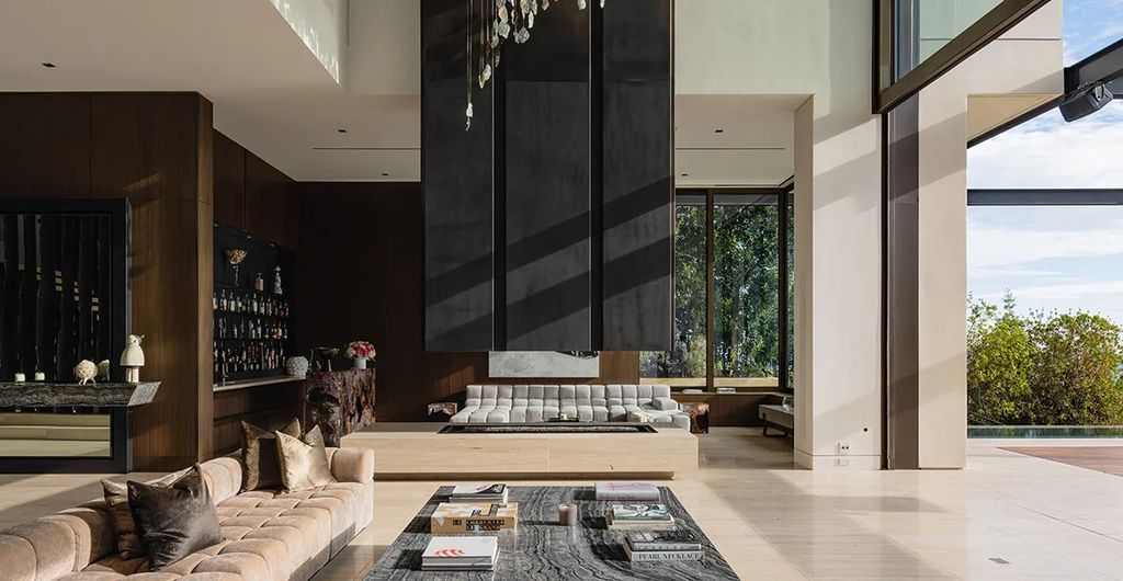 The expansive great room showcases 35-foot ceilings illuminated by mother-of-pearl fixtures that shimmer when the breeze moves through. A two-way fireplace divides the lounge and bar areas, while a vertical glass wall retracts to merge indoors with the terrace. The adjoining dining room frames lush gardens, and a chef’s kitchen features a La Cornue range, a large island, and a discreet butler’s pantry.