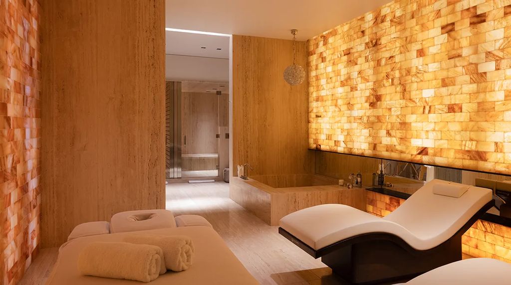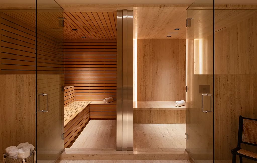Downstairs, the entertainment level includes a media lounge, poker room, and glass-enclosed wine cellar. The mirrored gym and Himalayan salt wellness center—with sauna, steam room, and cold-plunge tub—offer resort-level indulgence within the home itself.