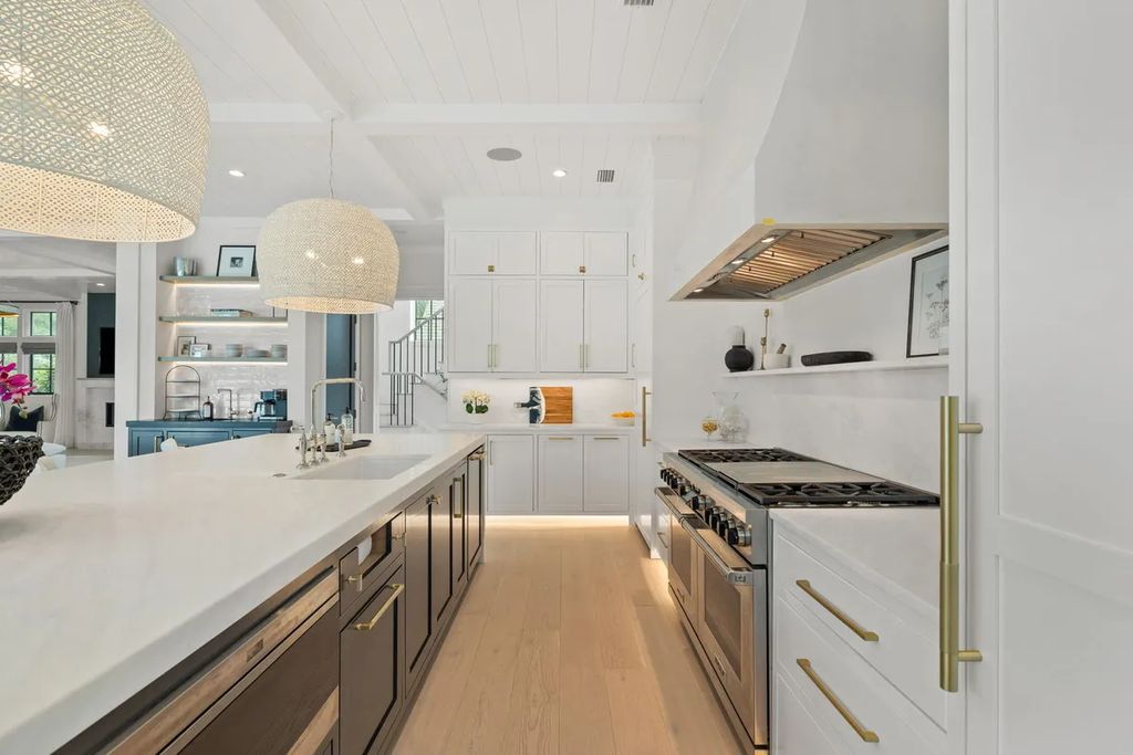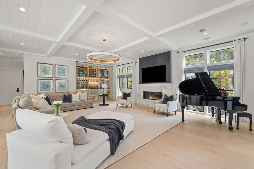 The nearly 6,000-square-foot, three-story estate features five bedrooms and six bathrooms, all designed to balance elegance with functionality. The living room, centered around a marble-framed fireplace, flows seamlessly into a hidden wine cellar enclosed by floor-to-ceiling glass, creating a sophisticated yet welcoming atmosphere. Custom fixtures, premium hardware, and radiant heated floors throughout the home add layers of luxury to every corner.