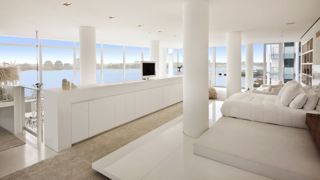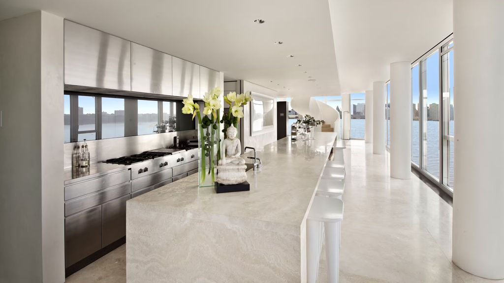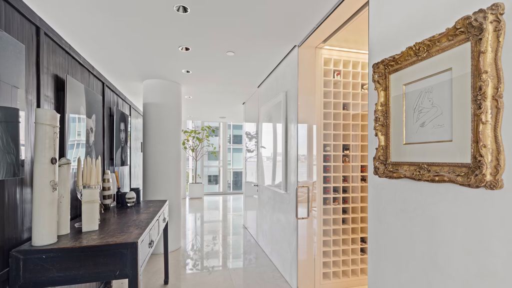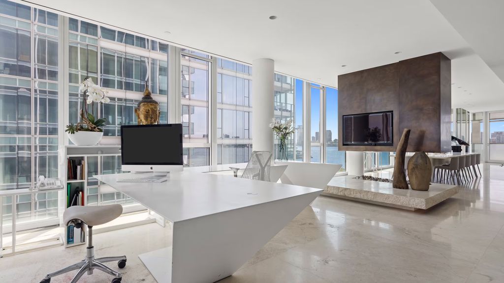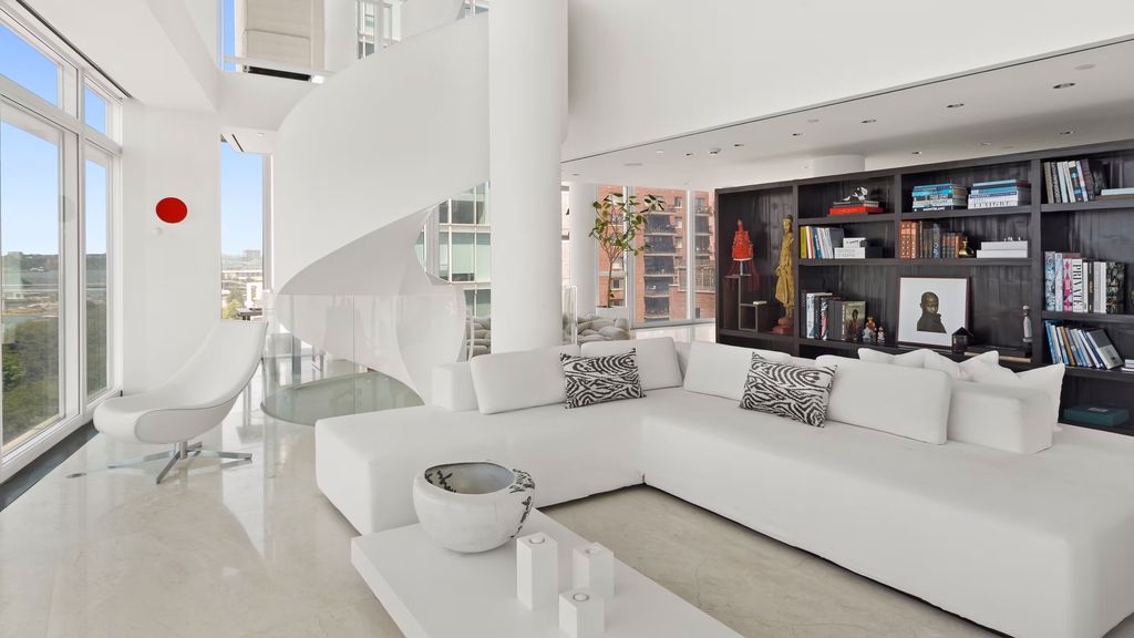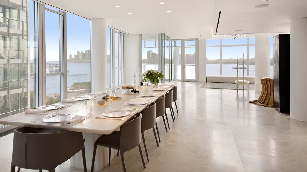 Set within the boutique Meier South Tower, the approximately 11,000-square-foot home spans the eighth, ninth, and 10th floors. It is the only individual residence in the building personally designed by architect Richard Meier, making it a rare architectural offering in the West Village.