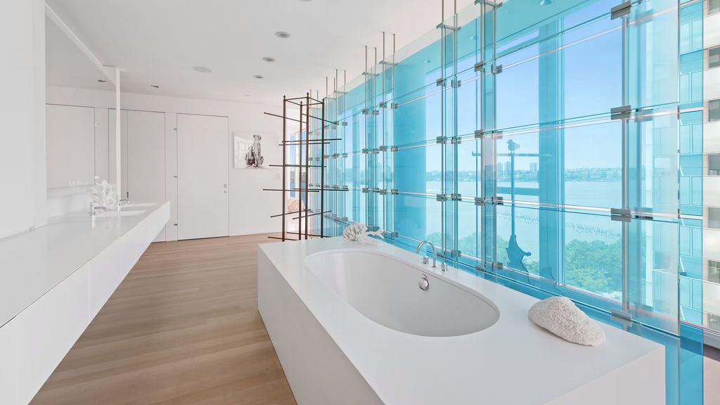 The entire 10th floor is dedicated to the primary suite, which includes a private studio or fitness area and a spa-style bathroom with dual vanities and a soaking tub positioned to capture the water views. A sleek white spiral staircase connects all three levels.