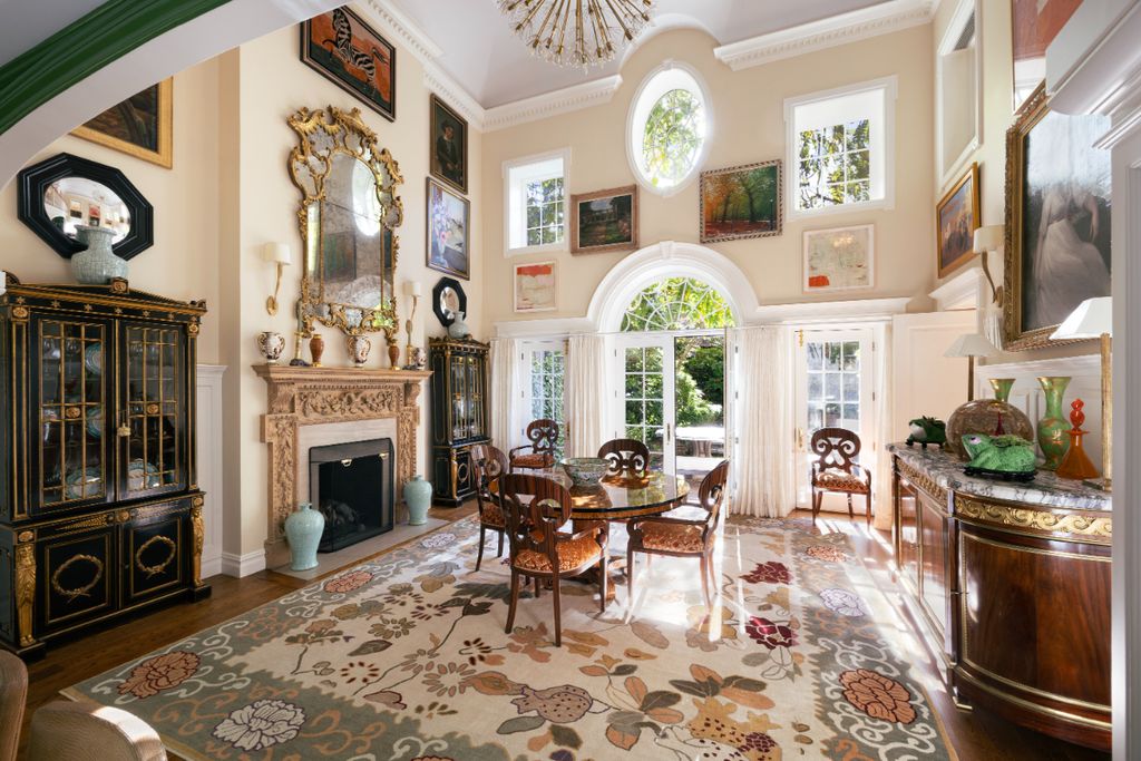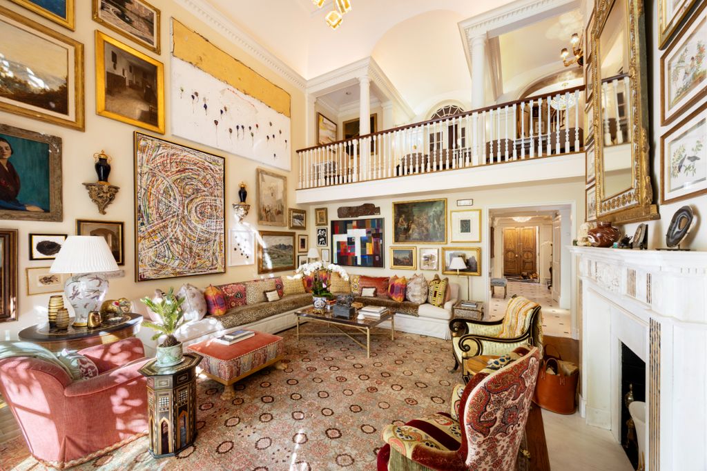 One of the signature spaces in the Suzy Welch Upper East Side Townhouse is the dramatic living room. Featuring 20-foot ceilings, a sculptural carved fireplace, and a mezzanine overlooking the room, this area acts as both a social hub and a serene retreat. The room’s full-height windows frame the rear garden like artwork, bringing natural light deep into the home throughout the day. The seamless connection between interior and exterior forms part of the property’s unique character, providing rare tranquility in the heart of Manhattan.