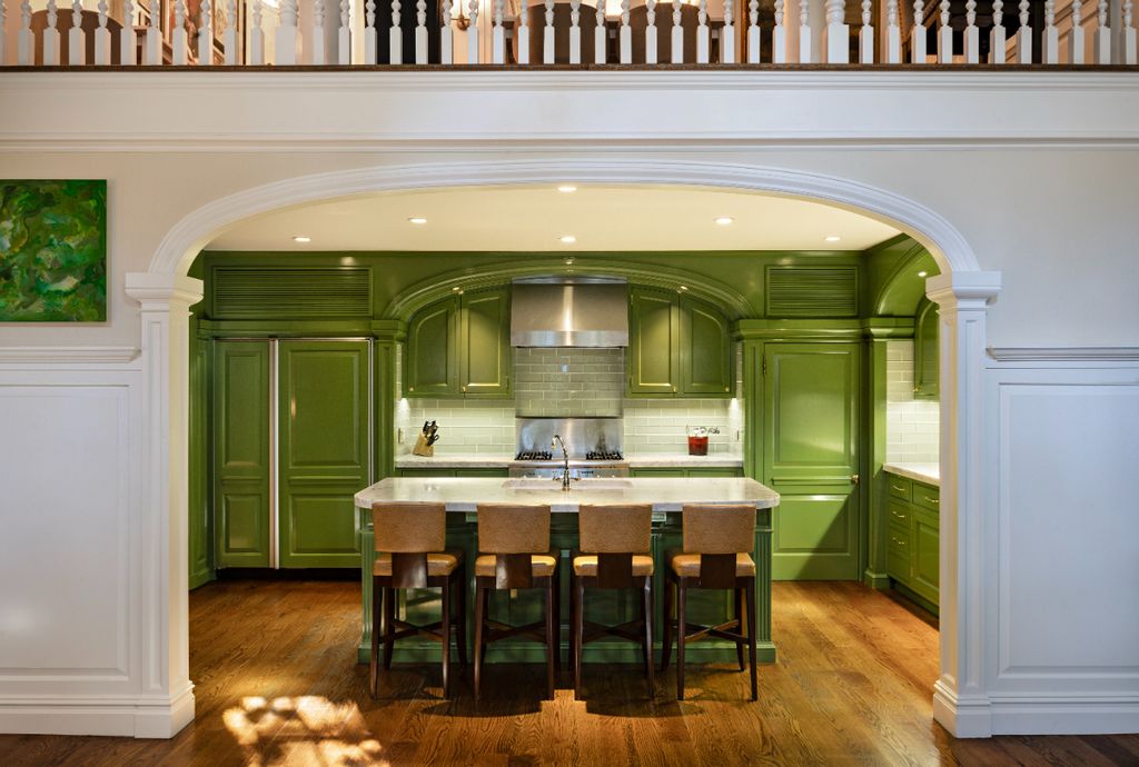 The kitchen and adjacent double-height family room continue the theme of openness and comfort. Designed with entertaining in mind, the kitchen offers generous prep areas, a sophisticated appliance suite, and a natural flow to the communal lounging space. The Suzy Welch Upper East Side Townhouse uses this layout to create a daily-living environment that feels intuitive and warm—a place where gatherings unfold easily and conversation moves from the kitchen island to the seating area overlooking the garden.