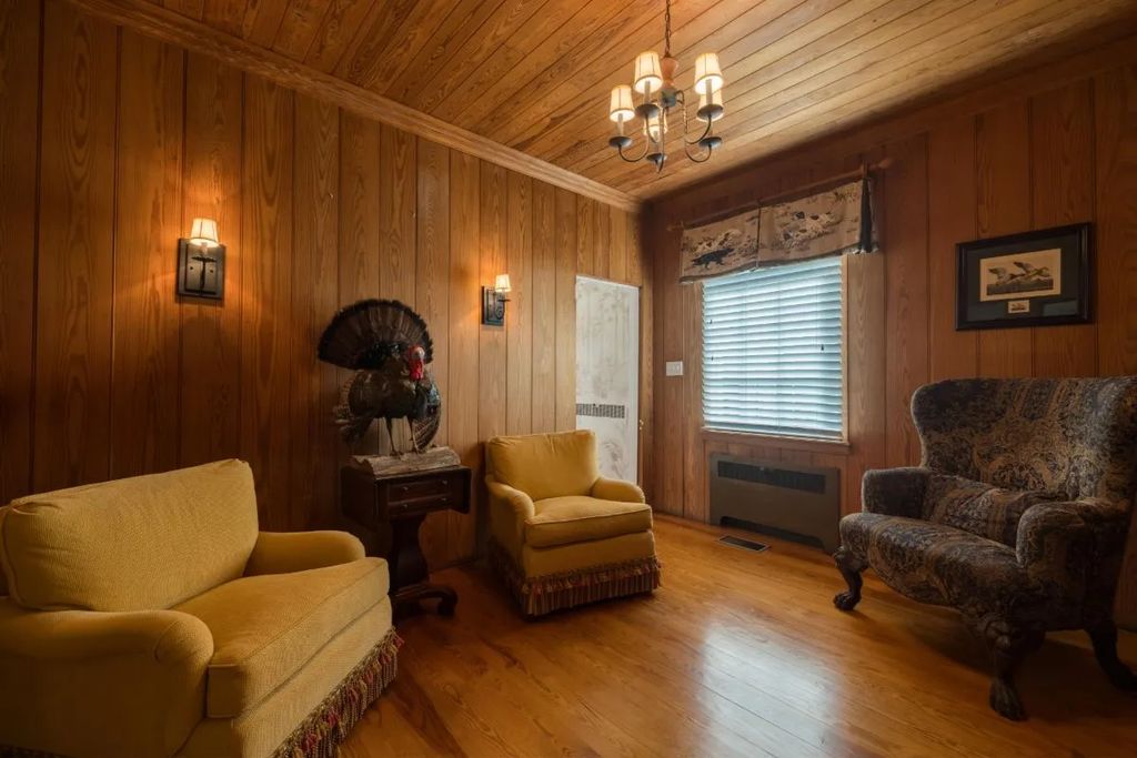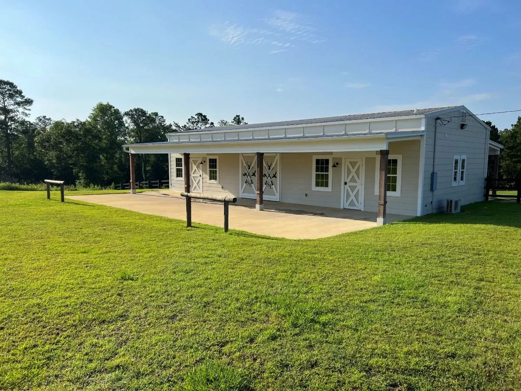 At the heart of the property sits a grand lodge perched on a bluff, with eight bedrooms and five and a half bathrooms. Designed for large gatherings, the lodge balances rustic charm with comfort, offering panoramic views of the landscape. Surrounding structures include a horse barn, a guest house, a manager’s residence, and several outbuildings—all set amid long private roads lined with pine forests.