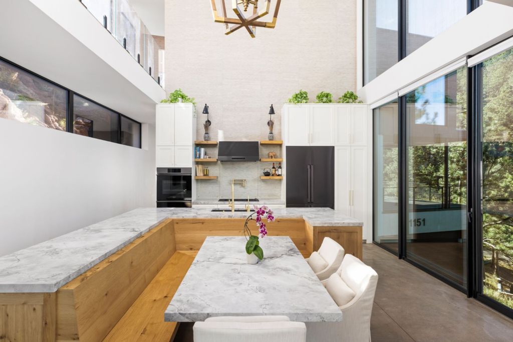 The breakfast nook extends toward panoramic glass, creating a casual dining space that visually connects to the surrounding terrain.
