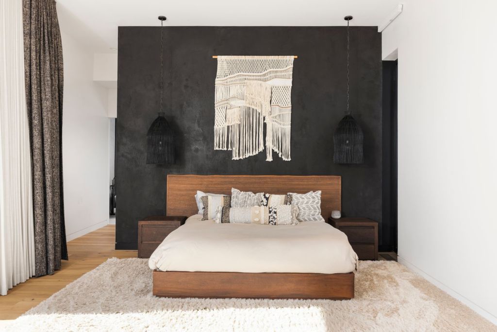 The primary suite occupies a dedicated wing of the home, emphasizing privacy and retreat-like comfort. The bedroom features minimalist styling layered with warm wood textures and soft neutral tones.