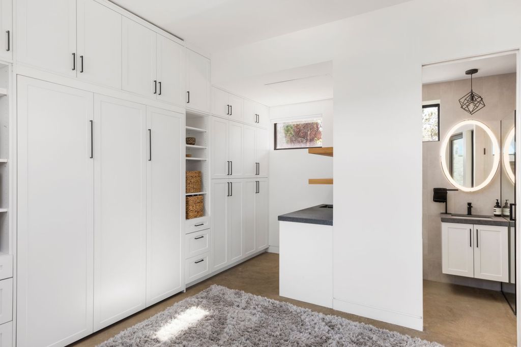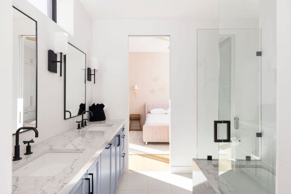 Additional bedrooms are arranged to provide both comfort and flexibility. Two guest rooms share a Jack-and-Jill bathroom featuring marble countertops and matte black fixtures, while a separate suite includes a wet bar and private patio access—ideal for extended guests or creative studio use.