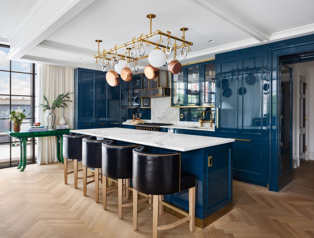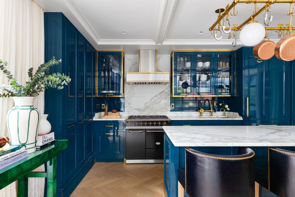 One of the home’s most striking features is the fully lacquered Aegean blue kitchen, finished with bronze hardware and Calacatta marble countertops. The space extends seamlessly to a cozy family room with a hidden “James Bond-style” TV that disappears into the cabinetry at the touch of a button.