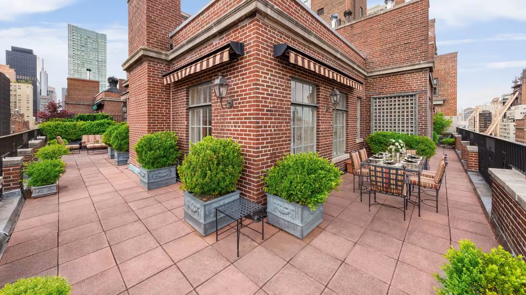 All these rooms flow naturally onto a wraparound terrace extending along three sides of the penthouse, offering an expanse of outdoor living space rarely found in a Manhattan penthouse of this era. Multiple seating areas accommodate dining, lounging, and quiet contemplation as the East River and city skyline unfold in the distance. Co-listing agent Mickey Conlon described the terrace to californialuxuryhouses as “an extension of the living room, not an afterthought,” and noted that it allows the home to function as a private sanctuary above Midtown.