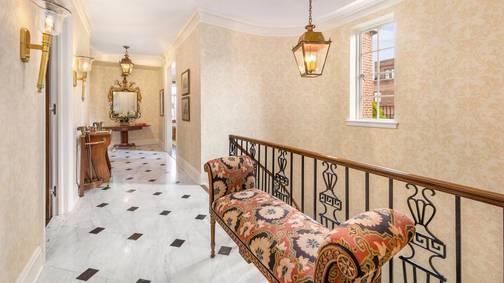 Descending the gently curved staircase—its original wrought-iron balustrade preserved since the building’s 1929 completion—the lower floor transitions into a quiet bedroom wing. The layout includes four bedrooms, each with a sense of privacy rarely associated with Manhattan apartments. The primary suite occupies a desirable corner position, benefiting from two-direction views and abundant natural light. Three of the bedrooms feature en-suite bathrooms, contributing to a layout that feels both gracious and practical for modern living. With four full bathrooms and two half-baths, the residence is thoughtfully arranged for both intimate family life and sophisticated entertaining.