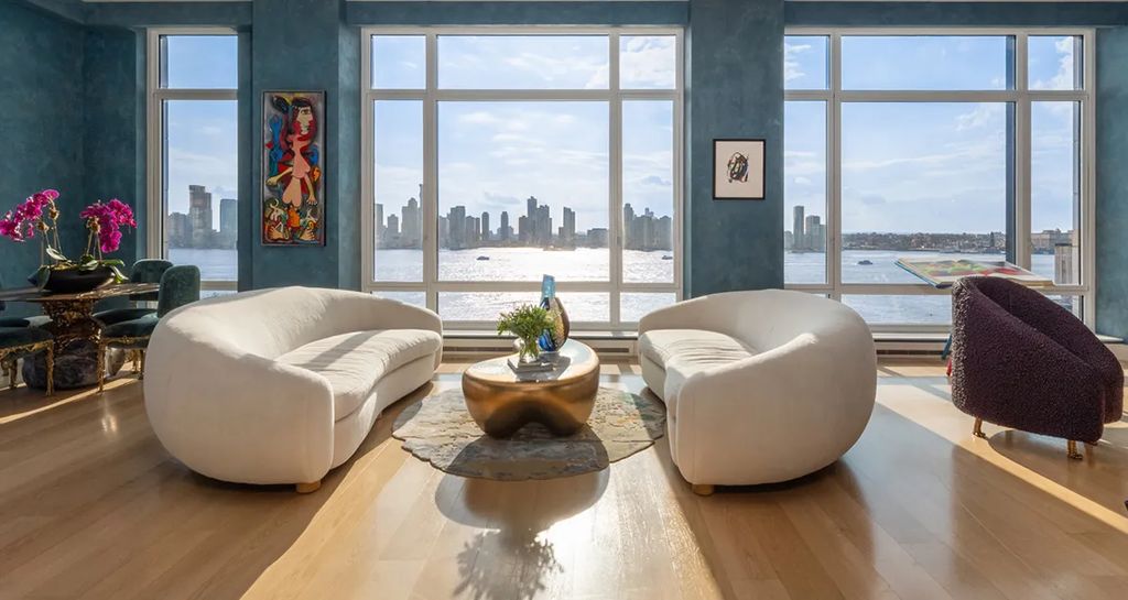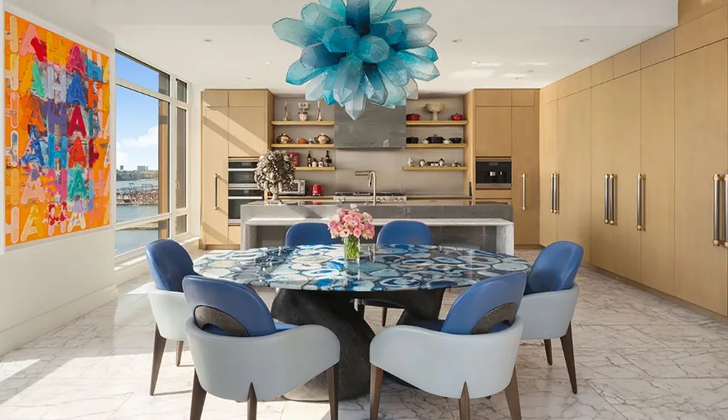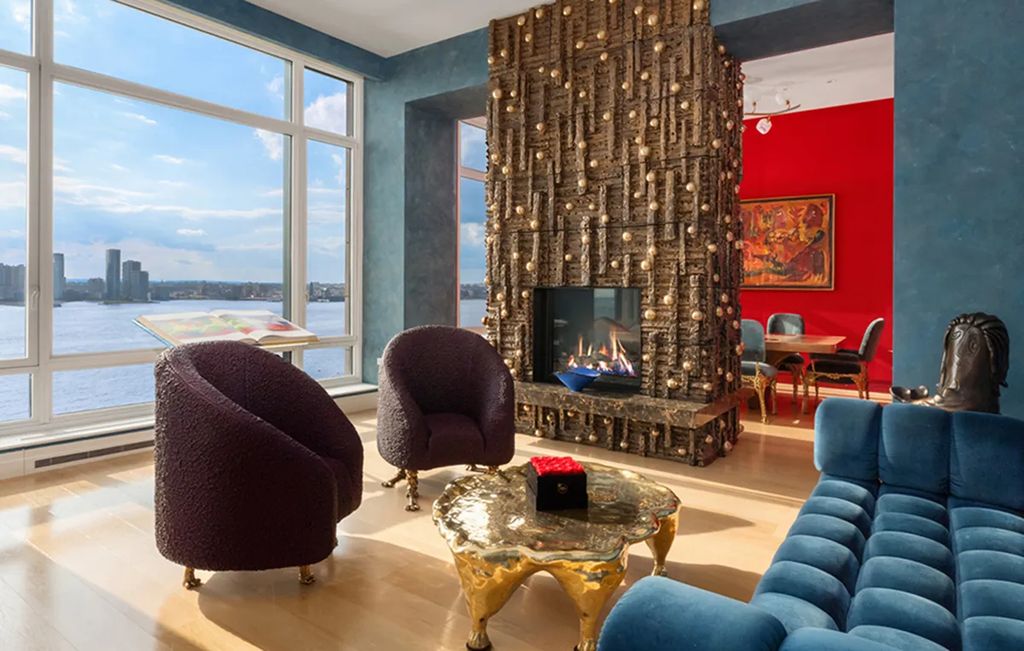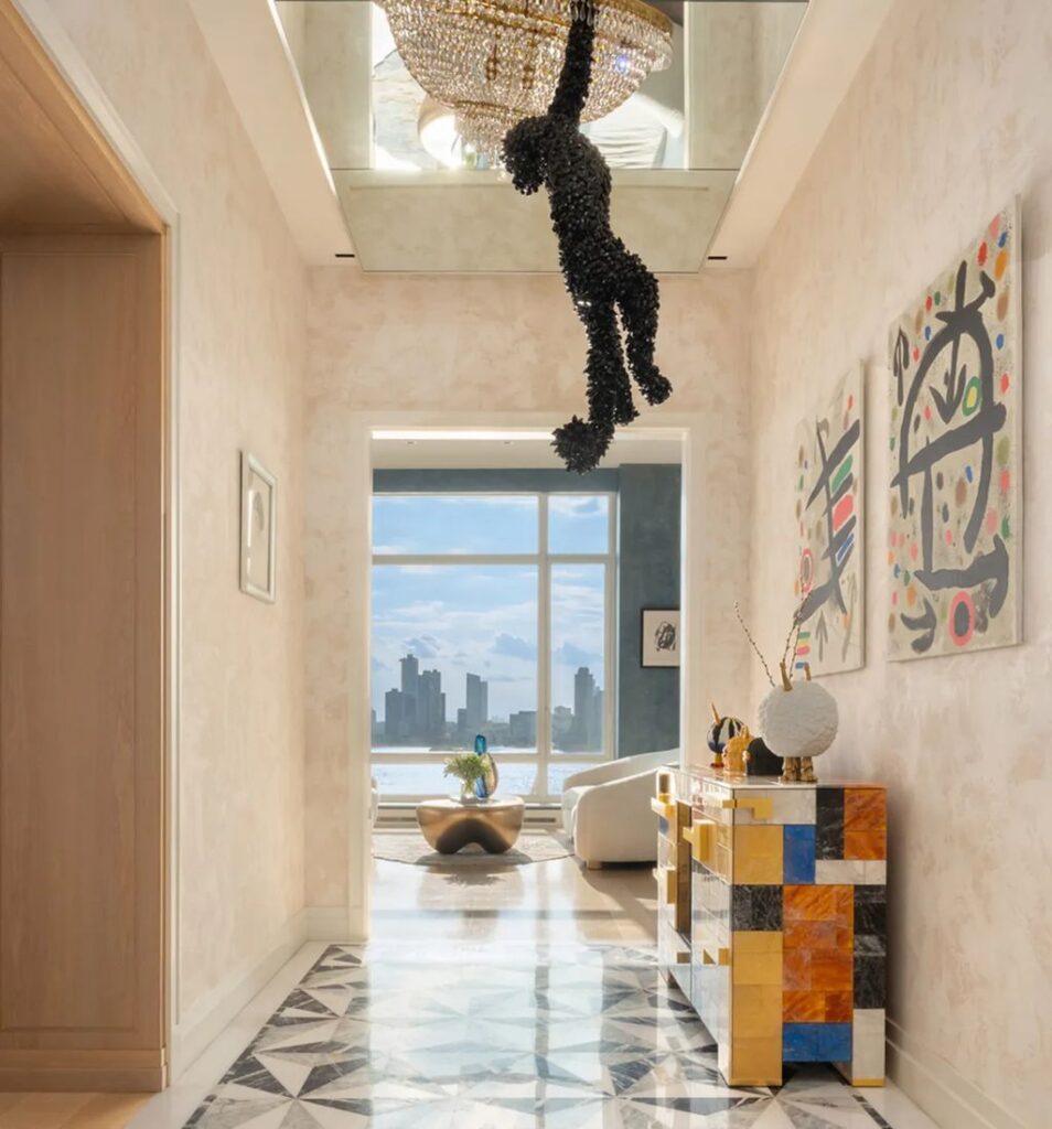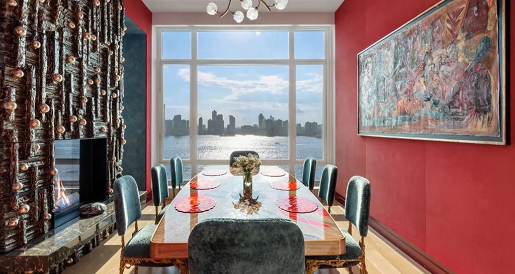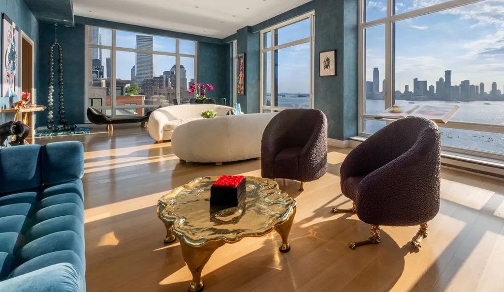 The penthouse sits atop a 14-story Robert A.M. Stern–designed building that has become synonymous with understated, ultra-luxury living in Tribeca. Inside, the residence unfolds across 13 rooms, including six bedrooms, five full bathrooms, and three powder rooms. The home embraces bold color palettes, sweeping river-facing glass walls, and custom-designed installations that give it a distinctive artistic identity.
