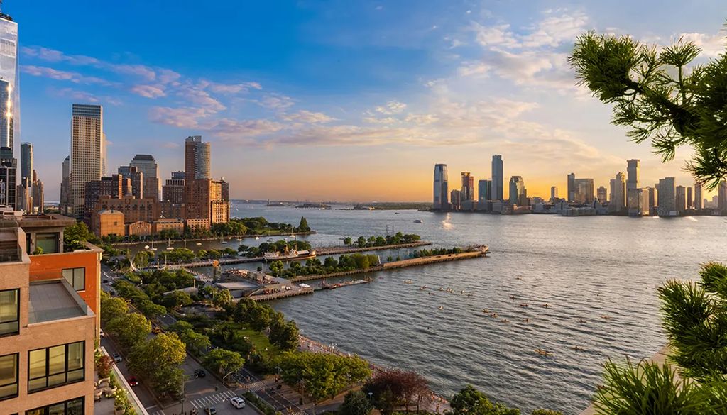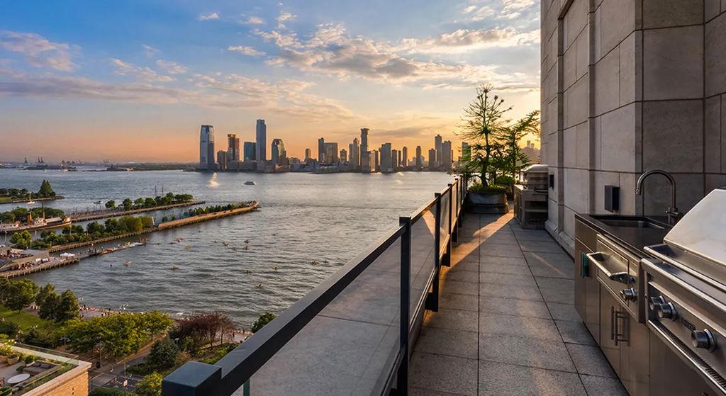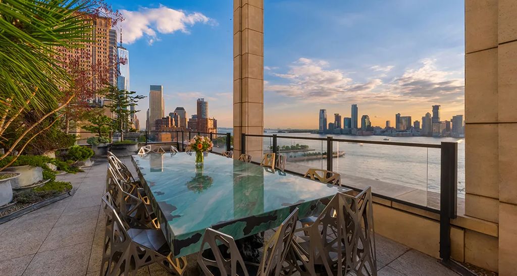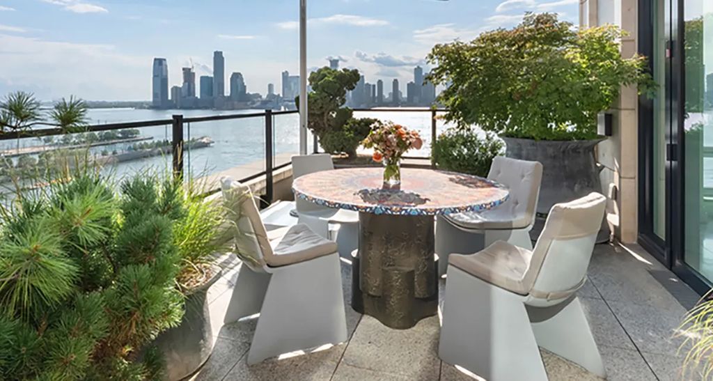 The crowning glory of the penthouse is the expansive wraparound rooftop deck that frames postcard views of Lower Manhattan, the Hudson River, and the Statue of Liberty. The space is large enough to accommodate multiple seating arrangements, a garden zone, art installations, or event hosting.
