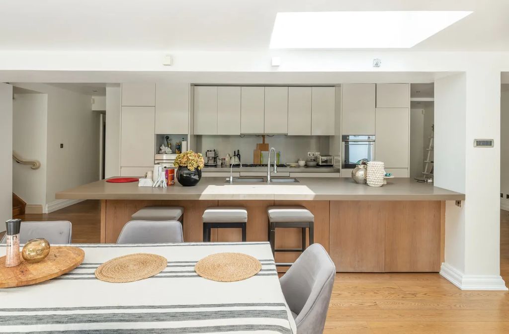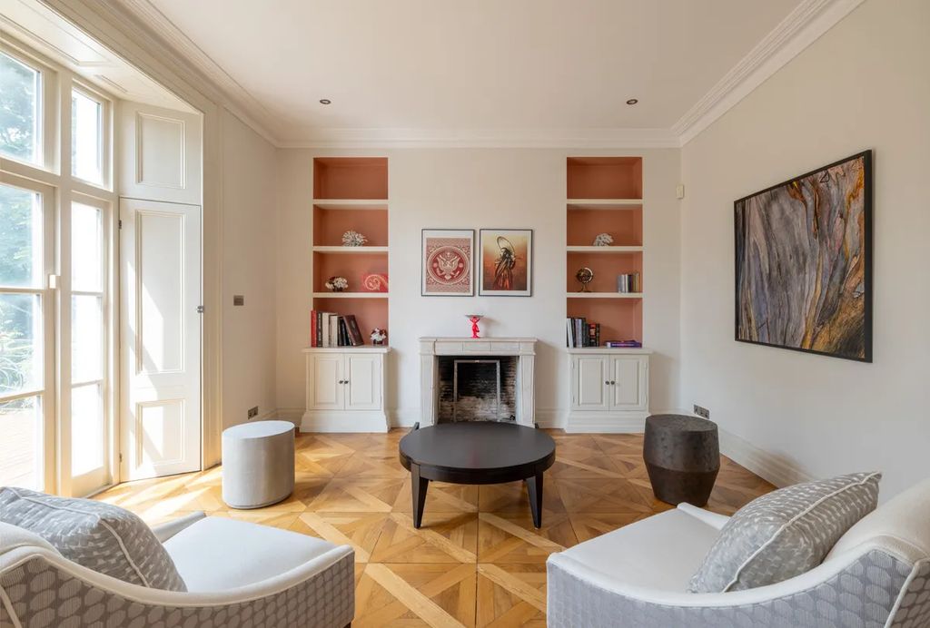 Highlights include an airy drawing room with terrace access, a light-filled kitchen and family room opening onto the garden, and a spacious principal suite with dual dressing rooms. Additional features such as a study, a garden room, and secure gated parking add to the property’s prestige. The lower-ground floor extension, completed prior to Moss’s ownership, created generous entertaining areas while maintaining a seamless connection to the outdoors.