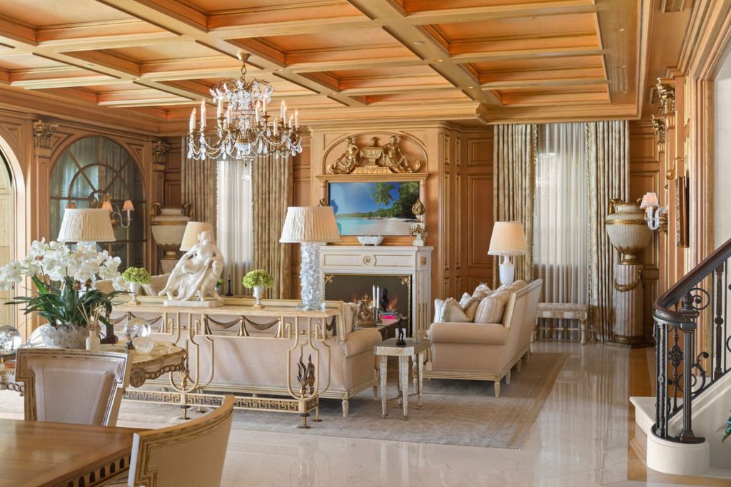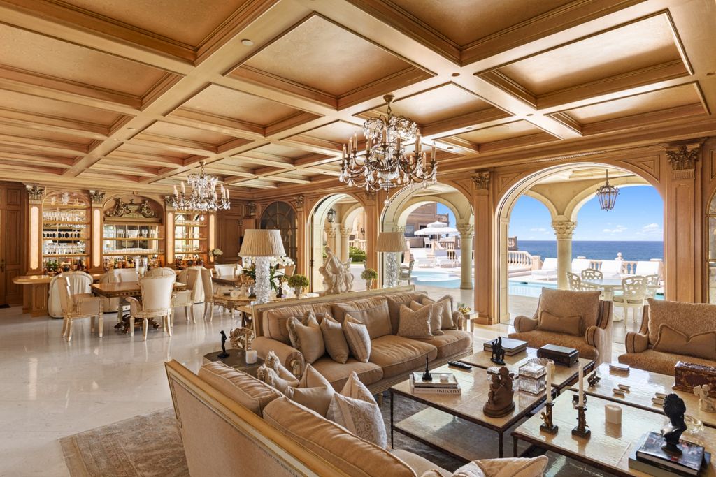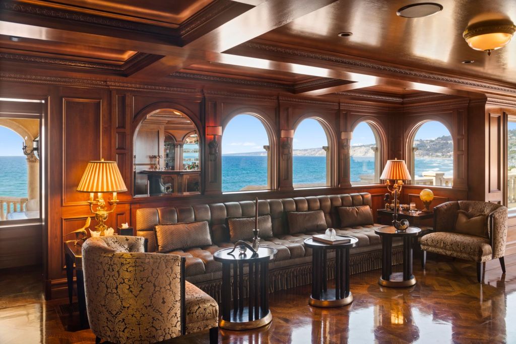 Inside, the main living spaces unfold with theatrical elegance. The grand living room is anchored by a sweeping wall of arched windows that frame uninterrupted views of the Pacific Ocean. Intricately detailed coffered ceilings, polished stone floors, and bespoke finishes reflect the influence of renowned interior designer Timothy Corrigan, whose work throughout the estate blends European sophistication with coastal California light.