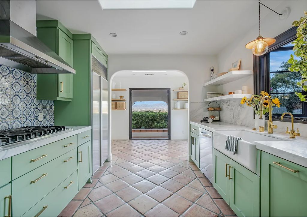 A fireside living room opens through folding steel doors to the terrace, while a mint-green chef’s kitchen showcases marble countertops, a glass-tile backsplash, a farmhouse sink, and professional-grade stainless appliances. A cozy den hides a winding staircase leading to a treehouse-like primary suite complete with a corner fireplace, generous walk-in closet, and a spa-inspired bath with a Victoria + Albert soaking tub.