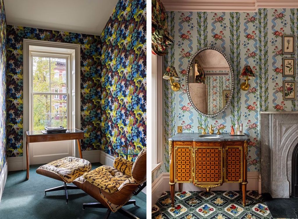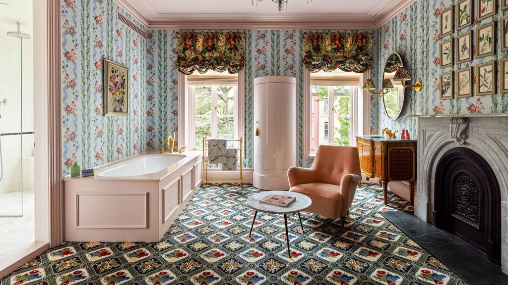 Throughout the home, floral prints, saturated hues, layered patterns, and crystal chandeliers create a visual narrative that departs from the muted minimalism often associated with luxury townhouses. Instead, each room unfolds as a distinct composition, unified by craftsmanship and confidence rather than restraint.