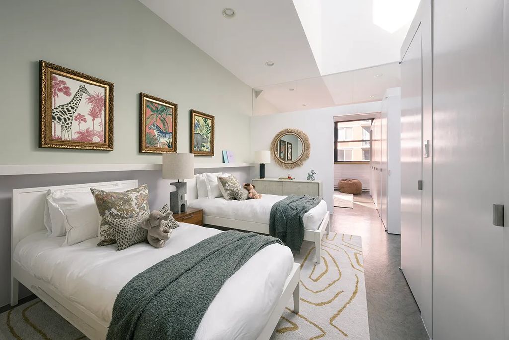 Tucked away for privacy, the corner primary suite serves as a serene sanctuary. Its dressing room is a highlight, featuring six floor-to-ceiling custom closets that any fashion icon would admire. The adjoining bathroom feels like a personal spa, complete with a deep soaking tub and a glass-enclosed shower framed in clean lines. Three additional bedrooms provide ample flexibility for guests, offices, or creative studios, all maintaining the loft’s cohesive aesthetic.