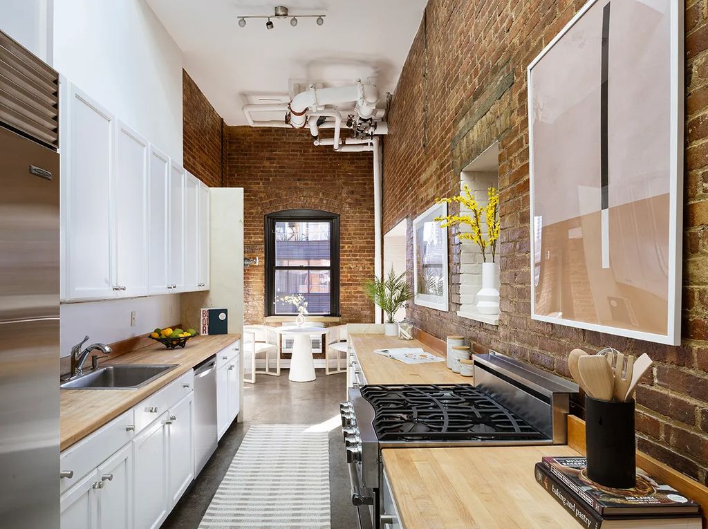 The galley-style kitchen blends practicality with charm. Butcher block countertops, a Sub-Zero refrigerator, and custom cabinetry create a sense of refined simplicity. A cozy breakfast nook sits beside a window, filling the space with morning light. The layout encourages fluid movement between cooking, dining, and entertaining—an urban retreat that feels both warm and elegant.