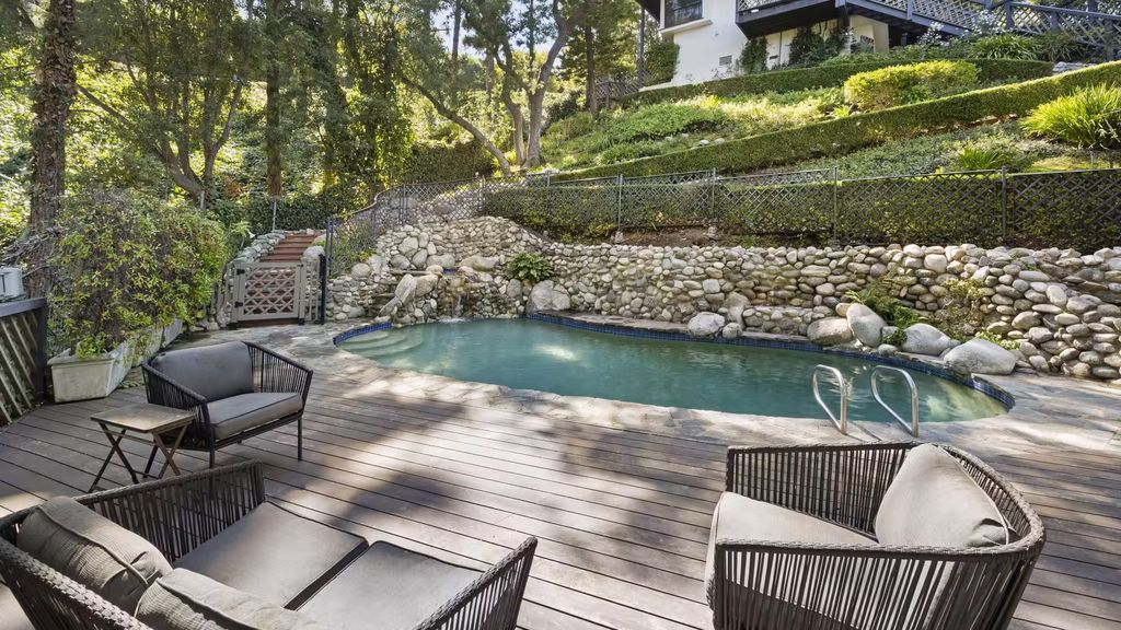 Set atop a hill, the home enjoys sweeping views of the Santa Monica Mountains and surrounding canyons. A series of steps leads from the main residence down to a pool and hot tub area, which also features a poolside deck and an outdoor shower—elements that reinforce the property’s resort-like sensibility.