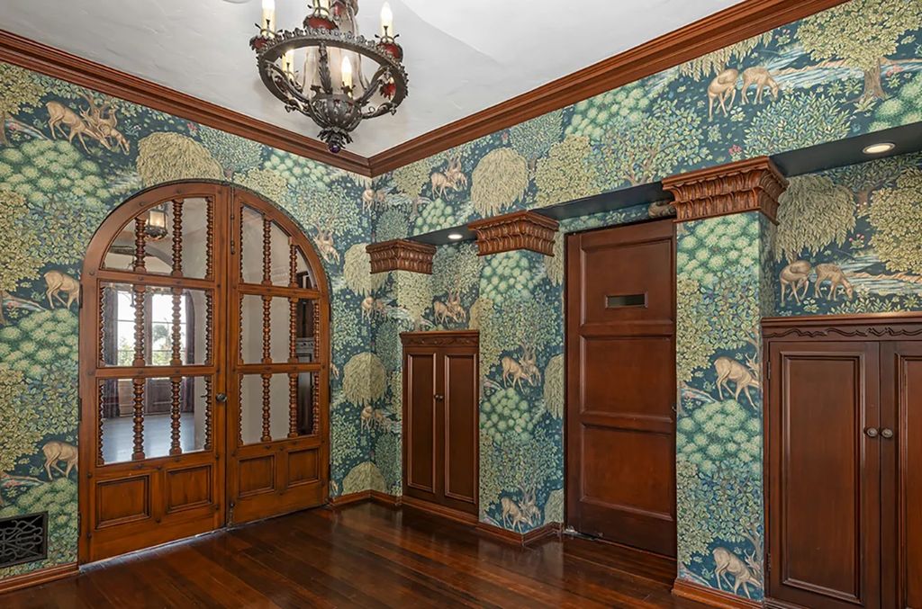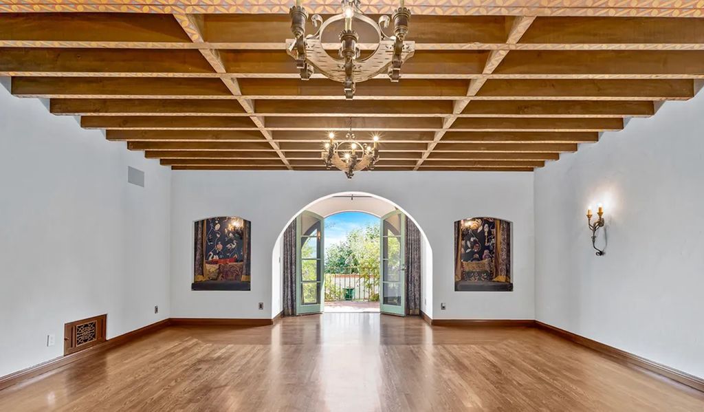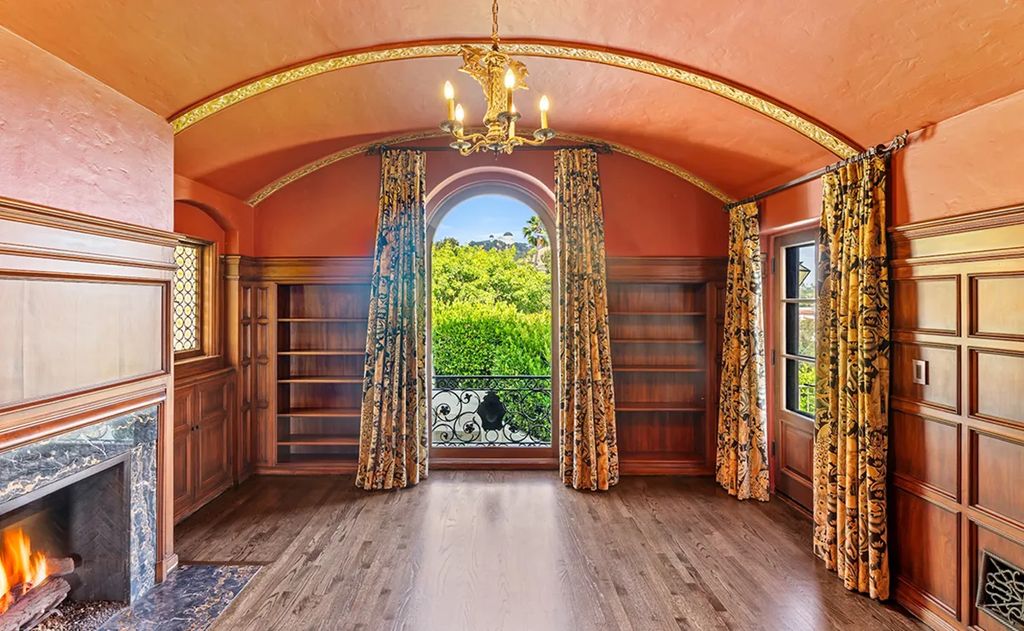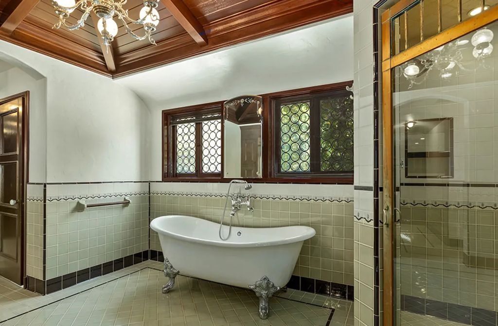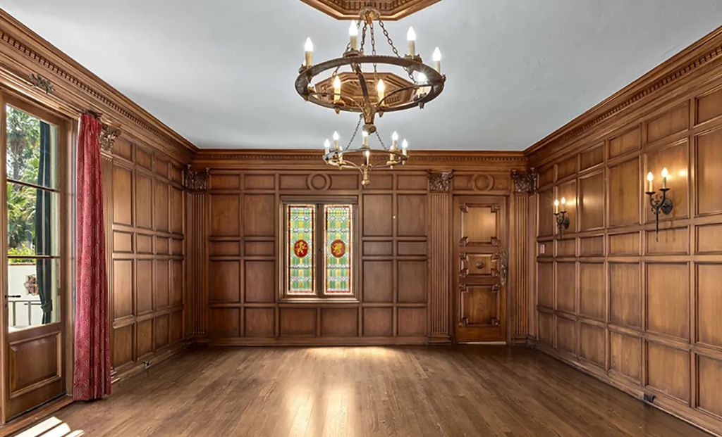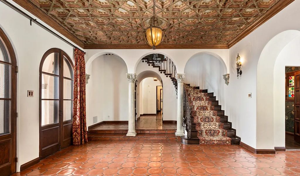 The estate, spanning approximately 9,000 square feet, blends period craftsmanship with modern refinement. Ten bedrooms and twelve bathrooms unfold across two and a half levels, each space revealing layers of intricate detailing. From the terracotta-tiled entryway with its carved wood ceiling and Corinthian arches to the coffered ceilings and stained glass windows, the home’s interior celebrates the artistry that defined early Hollywood architecture.