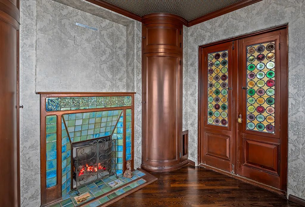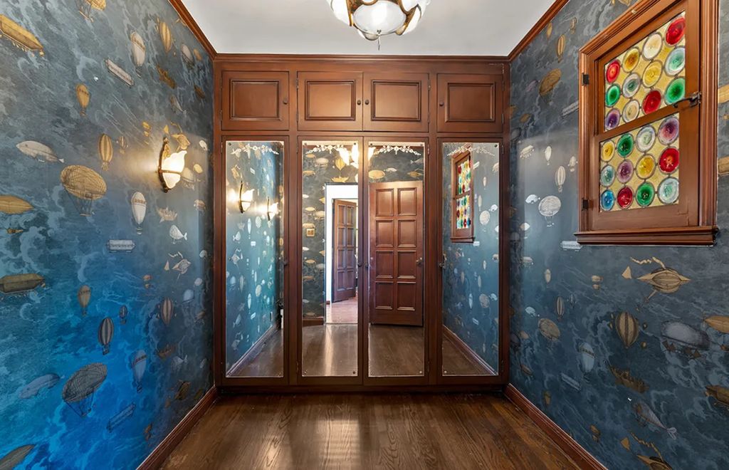 The primary suite offers a quiet retreat with a spacious sitting area, a vast walk-in closet, and a luxurious bath finished with marble and fine tile. Throughout the home, artistic touches such as whimsical wallpaper, hand-painted ceilings, and custom millwork express a rare level of craftsmanship. Hidden behind a bookshelf door, a secret lower-level room adds a touch of mystery. This space includes a pub-style lounge, a wine room, and an intimate media area designed for entertaining.