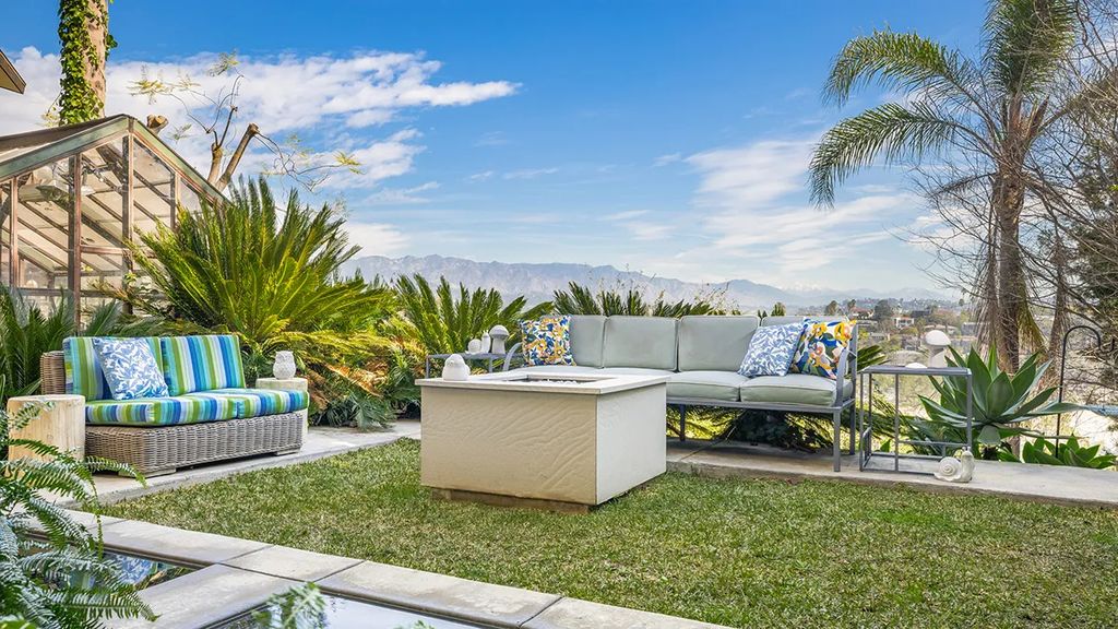 The home’s outdoor spaces extend the experience of comfort and serenity. The landscaped yard offers seating areas for relaxing or entertaining, a small greenhouse for gardening, and a hot tub with a cold plunge pool, creating year-round enjoyment. From the property, the San Gabriel Mountains rise dramatically, creating the backdrop that Obst affectionately called the “Silver Lake Alps” during snowy winters.