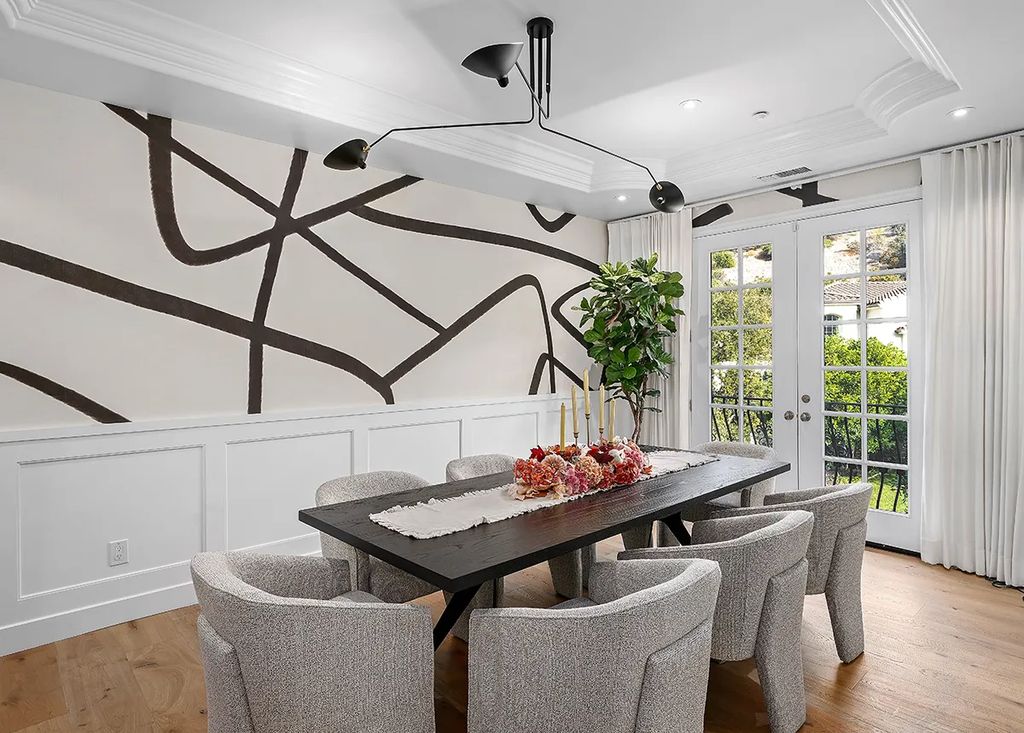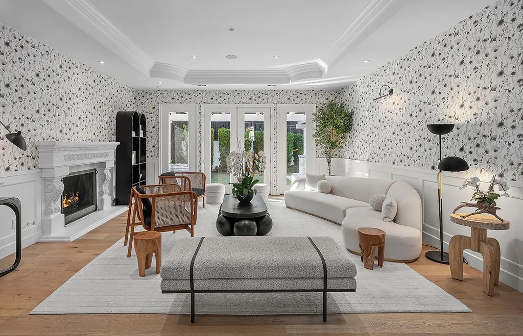 Entering through double doors into the split-level foyer, guests are greeted by a coffered-ceiling living room adorned with decorative wallpaper and a fireplace. French doors open onto the backyard, establishing a strong indoor-outdoor connection. Adjacent to the living space, a formal dining area and an all-white chef’s kitchen, complete with Thermador and Sub-Zero appliances, a blue-hued eat-in island, and a window-lined breakfast nook with banquette seating, serve as the heart of the home.