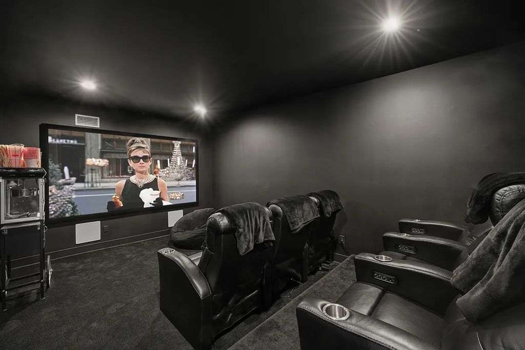 The fireside primary suite includes a private office and a marble-clad bathroom with a spa-like ambiance. Additional main-level amenities include a private movie theater and a guest bedroom with its own bath, providing comfort and versatility. On the lower level, three en-suite bedrooms, a flexible bonus room, and a mirrored gym accommodate family and guests, while sophisticated lighting and design elements maintain a cohesive, high-end aesthetic throughout.