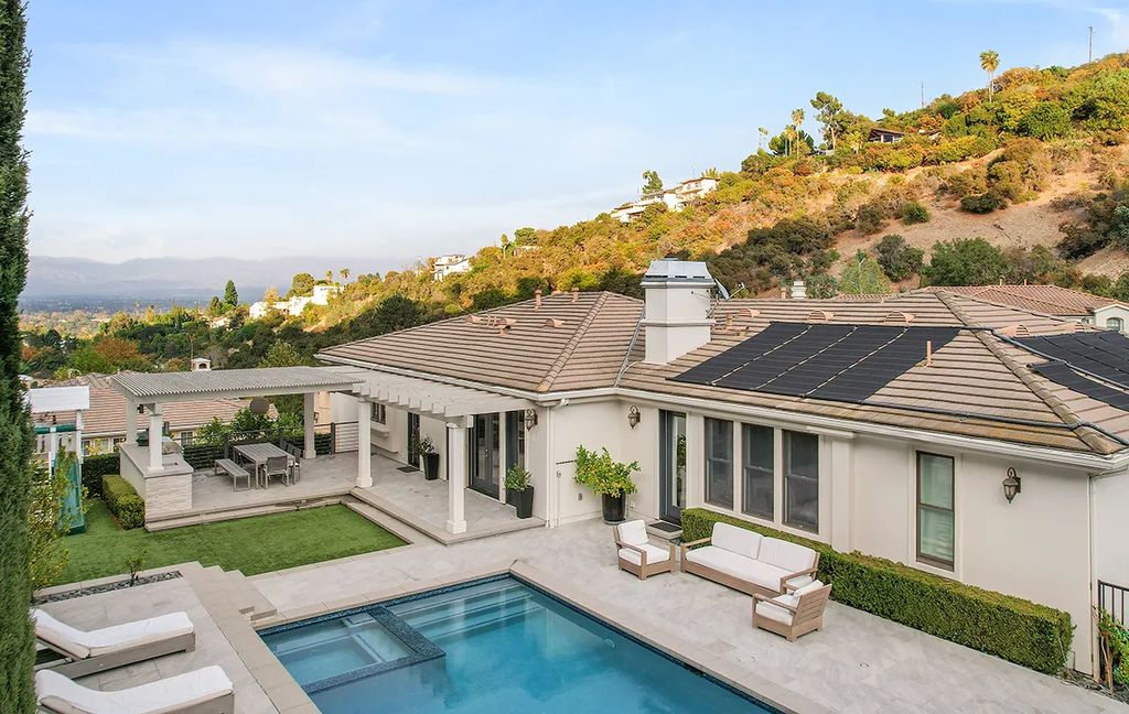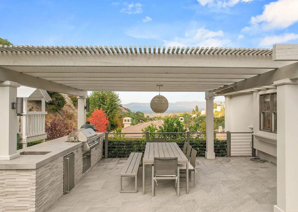 The nearly half-acre property emphasizes outdoor entertainment with a solar-heated pool and spa, complemented by a pergola-shaded terrace and full outdoor kitchen. “The backyard was designed with both relaxation and hosting in mind,” Casey Gamm from Douglas Elliman shared with californialuxhouses. “It’s perfect for alfresco dining, summer gatherings, or enjoying the stunning mountain views in privacy.”
