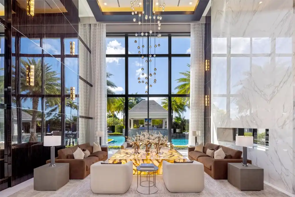 According to the listing, Palazzo di Lago embodies “the pinnacle of luxury living in South Florida,” with handcrafted finishes, imported materials, and custom-designed crystal chandeliers that cast an ethereal glow throughout the home.