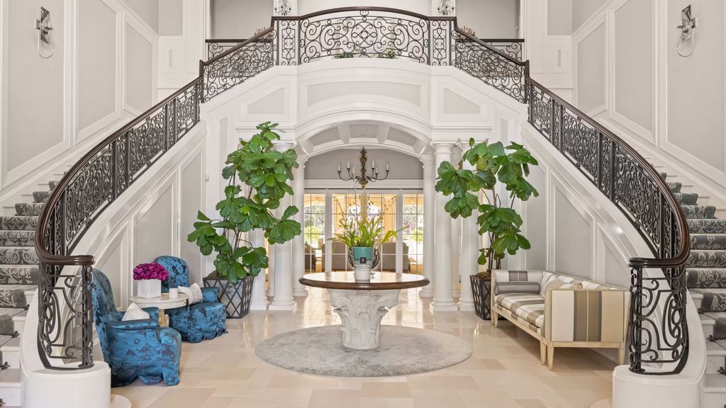 Designed by acclaimed architect Richard Landry, often referred to as the “King of the Megamansion,” the residence encompasses over 30,000 square feet of living space. The main home makes a dramatic first impression with a double-height foyer anchored by a sweeping wrought-iron imperial staircase, setting the tone for the estate’s European-inspired design.