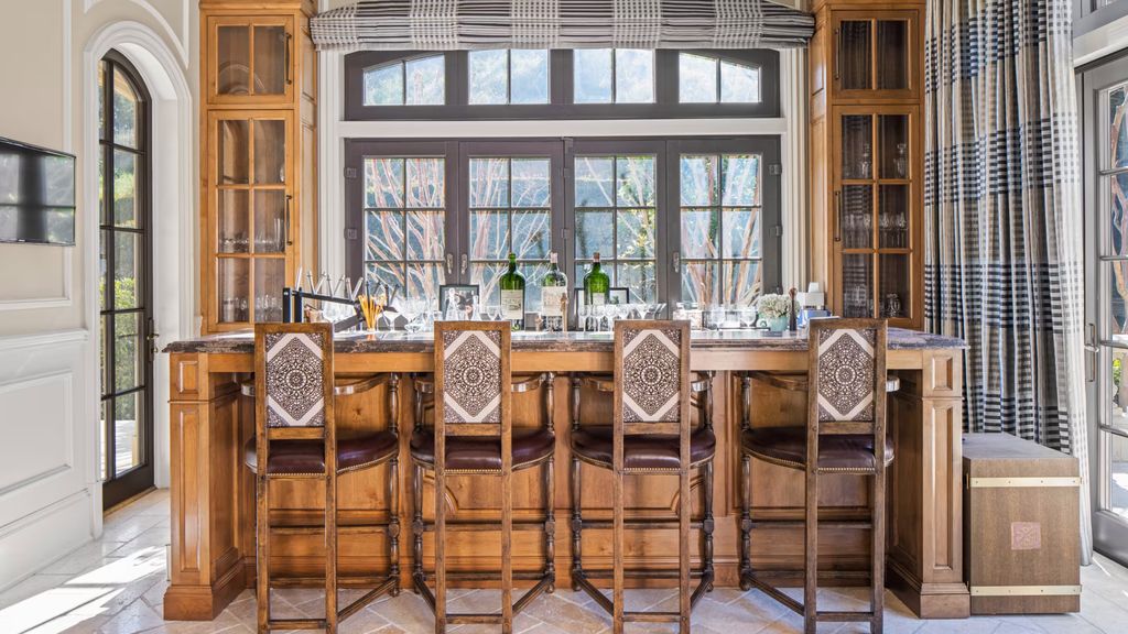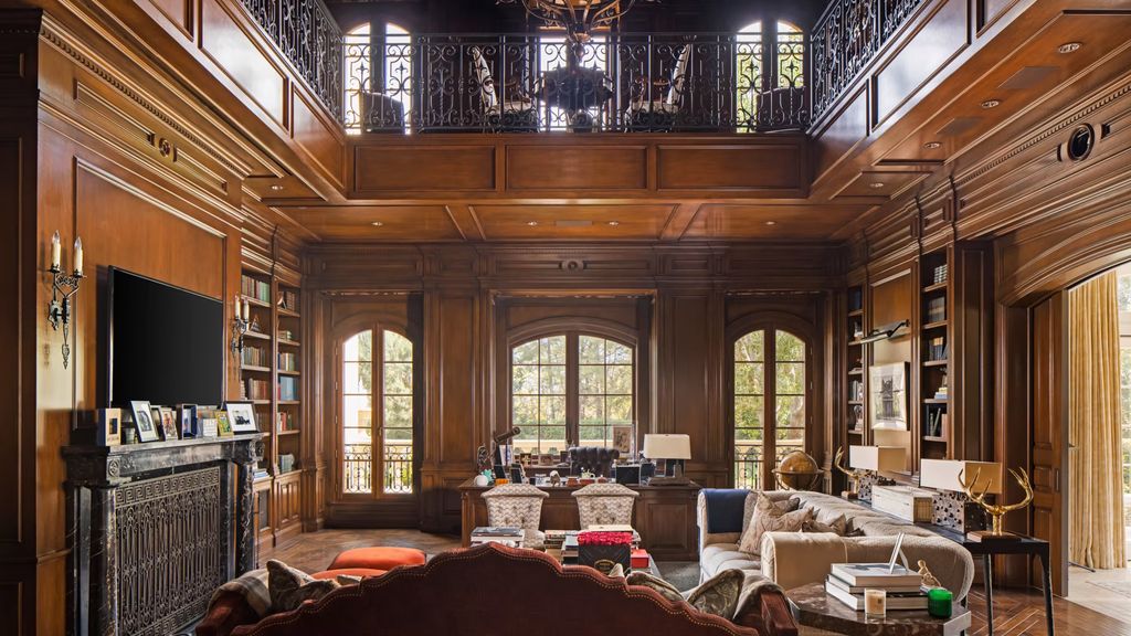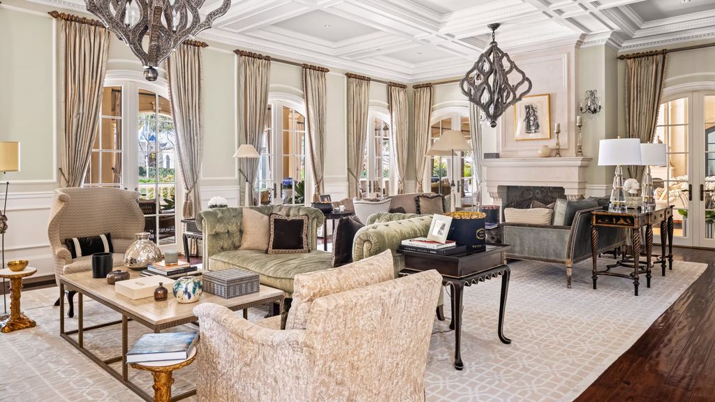 The estate offers 12 bedrooms and 20 bathrooms, accommodating large-scale living with ease. Interior spaces include formal living and dining rooms, a chef’s kitchen with dual islands, a sun-filled breakfast nook, and a spacious family room ideal for everyday living.