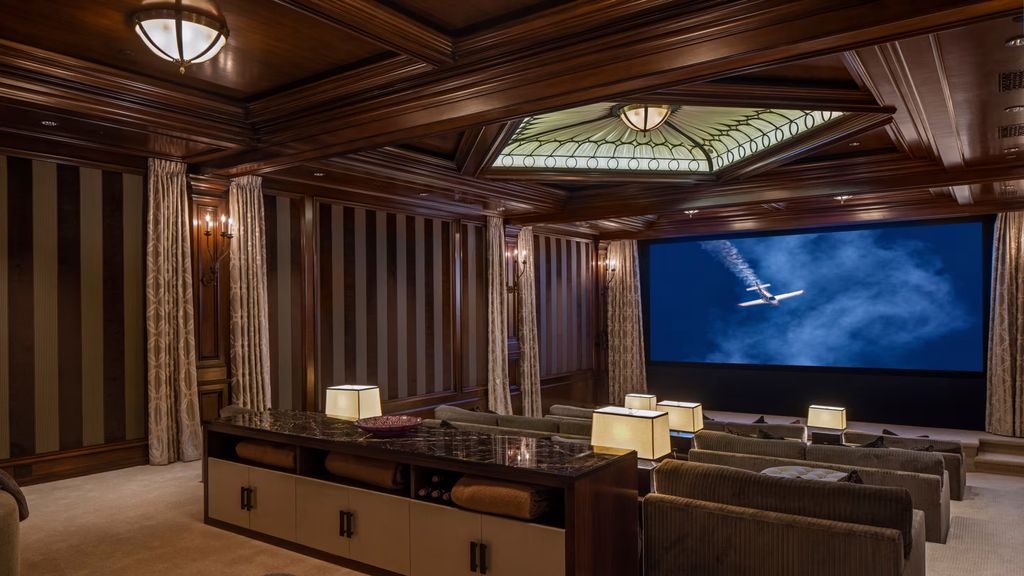 Luxury amenities extend to a wood-paneled library, private movie theater, wet bar, wine cellar with tasting room, and a professional-grade gym. The primary suite functions as a private retreat, featuring a sitting area, his-and-hers bathrooms, and two dressing rooms.