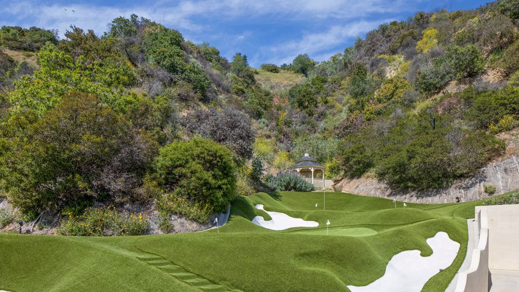 Highlights include a five-hole private golf course, tennis court, skate park, and a resort-style grotto pool. A separate guest house provides additional accommodations for visitors or staff.