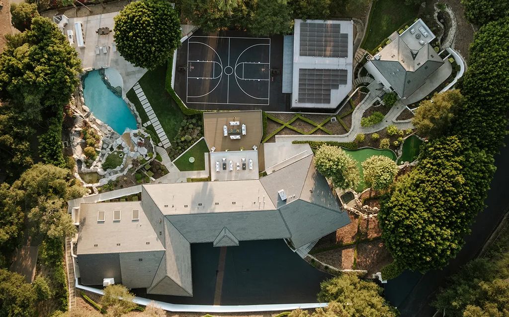 At the heart of the estate is a two-story gym with a full-size boxing ring, opening through aircraft-style hangar doors to a basketball and sports court. There is also a fireside movie theater with wet bar, a private salon, and dedicated staff quarters.