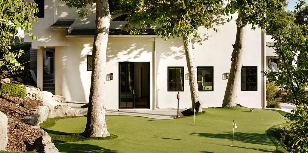 Set on nearly two acres, the landscaped grounds reveal putting greens, a grotto-style pool with waterslide, and multiple alfresco lounges. A detached two-bedroom guesthouse complements the main residence, while an attached three-car garage and additional parking accommodate up to a dozen vehicles.