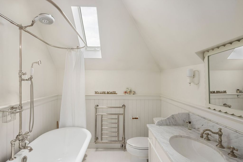 The en-suite bathroom features a marble-topped vanity, vintage-style fixtures, and a freestanding tub positioned beneath an angled skylight. The effect is intimate and serene, offering a sense of retreat rarely found in urban townhouses.