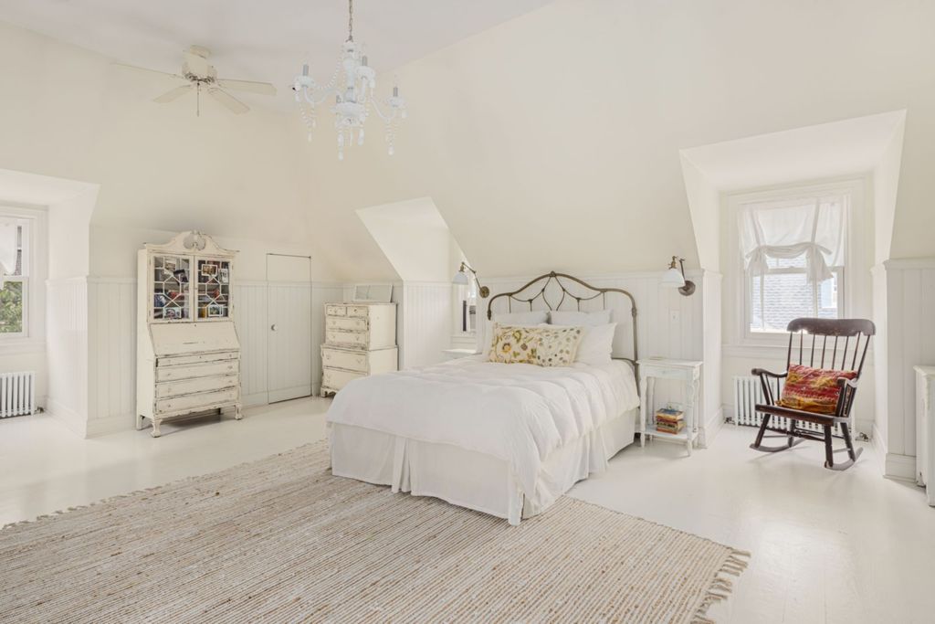 The third floor opens into a loft-like primary suite with angled ceilings and exposures on three sides, bringing light into the space throughout the day. Painted floors and beadboard paneling give the suite a refined attic character, while subtle architectural cutouts soften transitions between sleeping, seating, and storage areas.