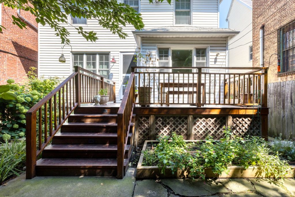 At the rear of the home, a raised wooden deck extends directly from the main level, creating an ideal setting for outdoor meals and gatherings. Steps lead down into a landscaped garden that unfolds in layers, beginning with a paved stone patio nestled beneath mature trees.