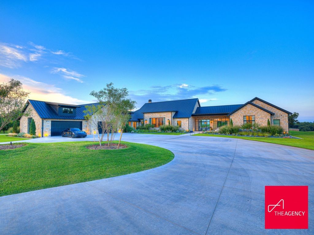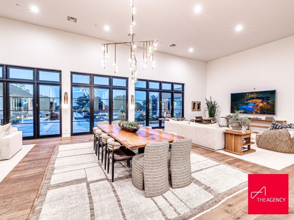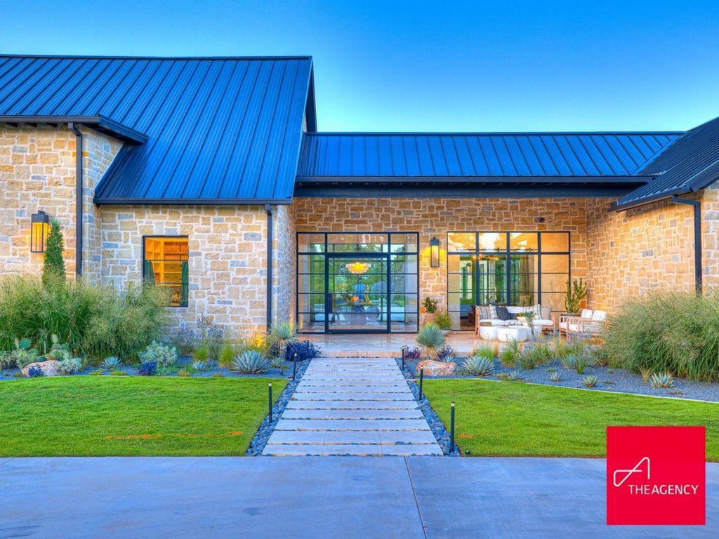 Approached via a winding, tree-lined driveway framed by private ponds, the main residence gradually reveals itself as a long, horizontal structure inspired by Texas Hill Country architecture. Cream-toned masonry, a standing-seam metal roof, and expansive black-framed windows create a refined yet grounded aesthetic.