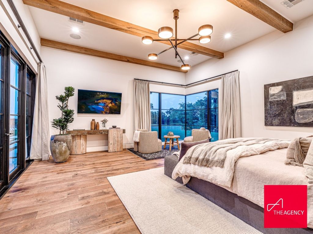 Tucked away from the main living areas, the primary suite offers a tranquil retreat overlooking the expansive grounds. Exposed wood beams stretch across the ceiling, adding warmth and architectural character, while corner windows frame uninterrupted views of the surrounding landscape.