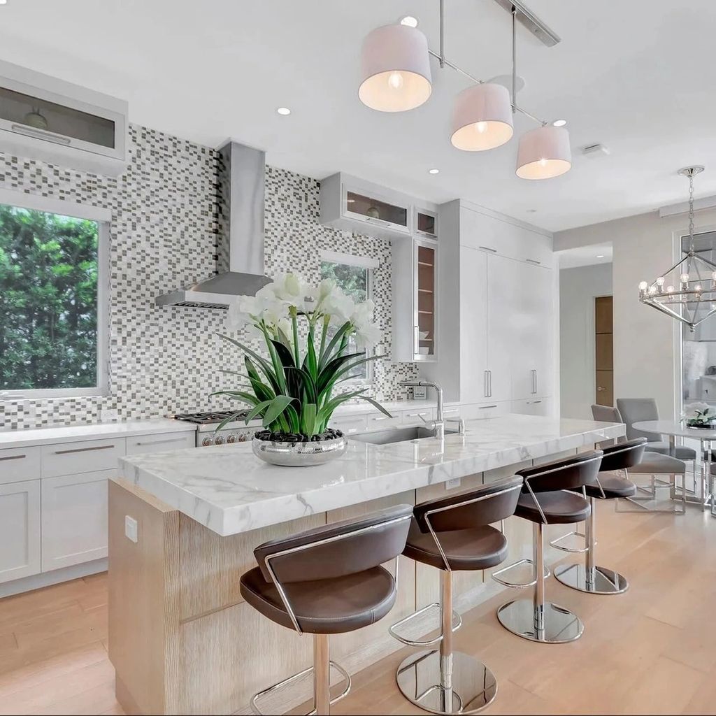 At the heart of the home lies a striking kitchen outfitted with European cabinetry, premium Wolf and Sub-Zero appliances, and an oversized island with waterfall stone countertops. The clean lines and minimalist design give the space a gallery-like feel, while subtle lighting and smart storage elevate functionality. It’s a space designed for performance, much like the athlete who calls it home.