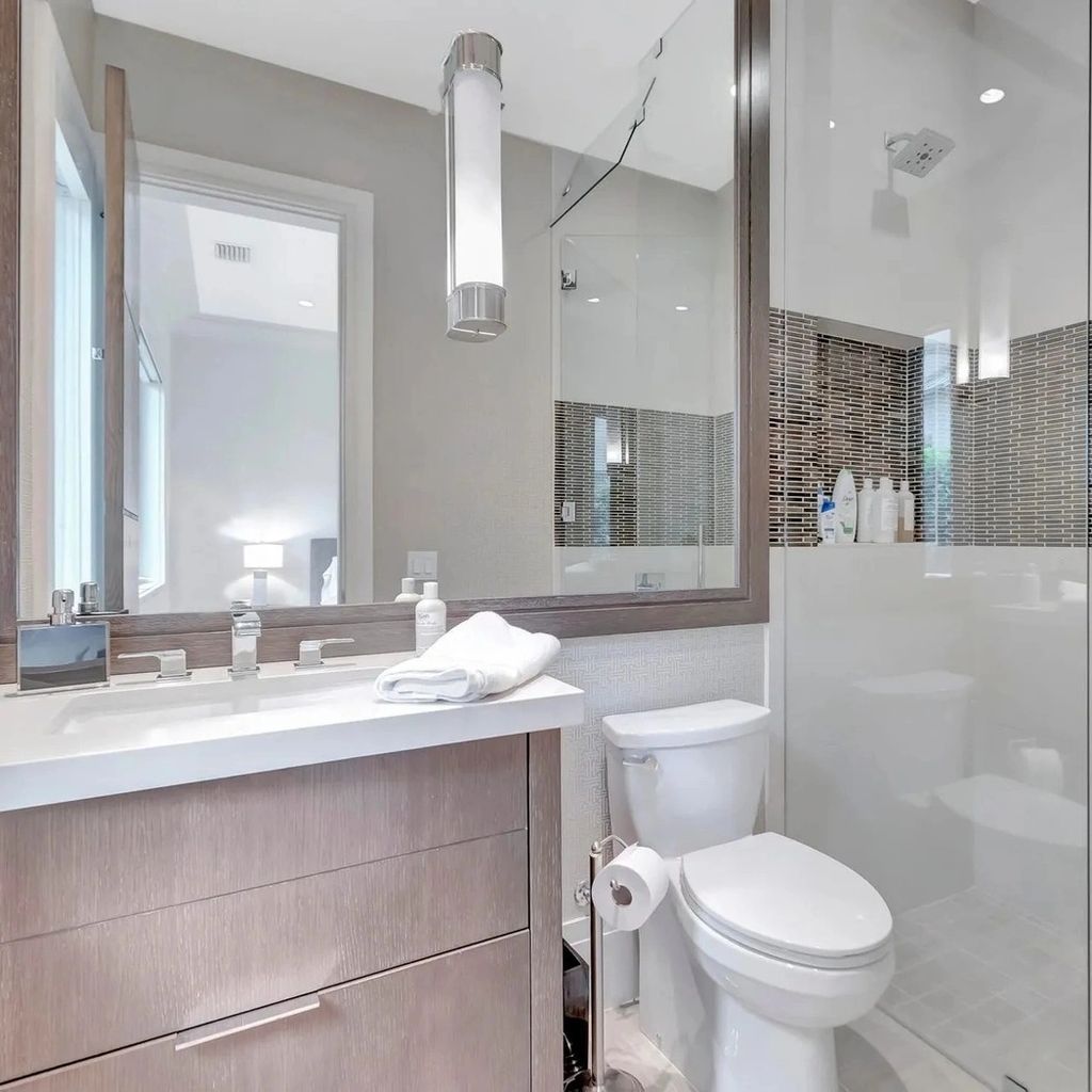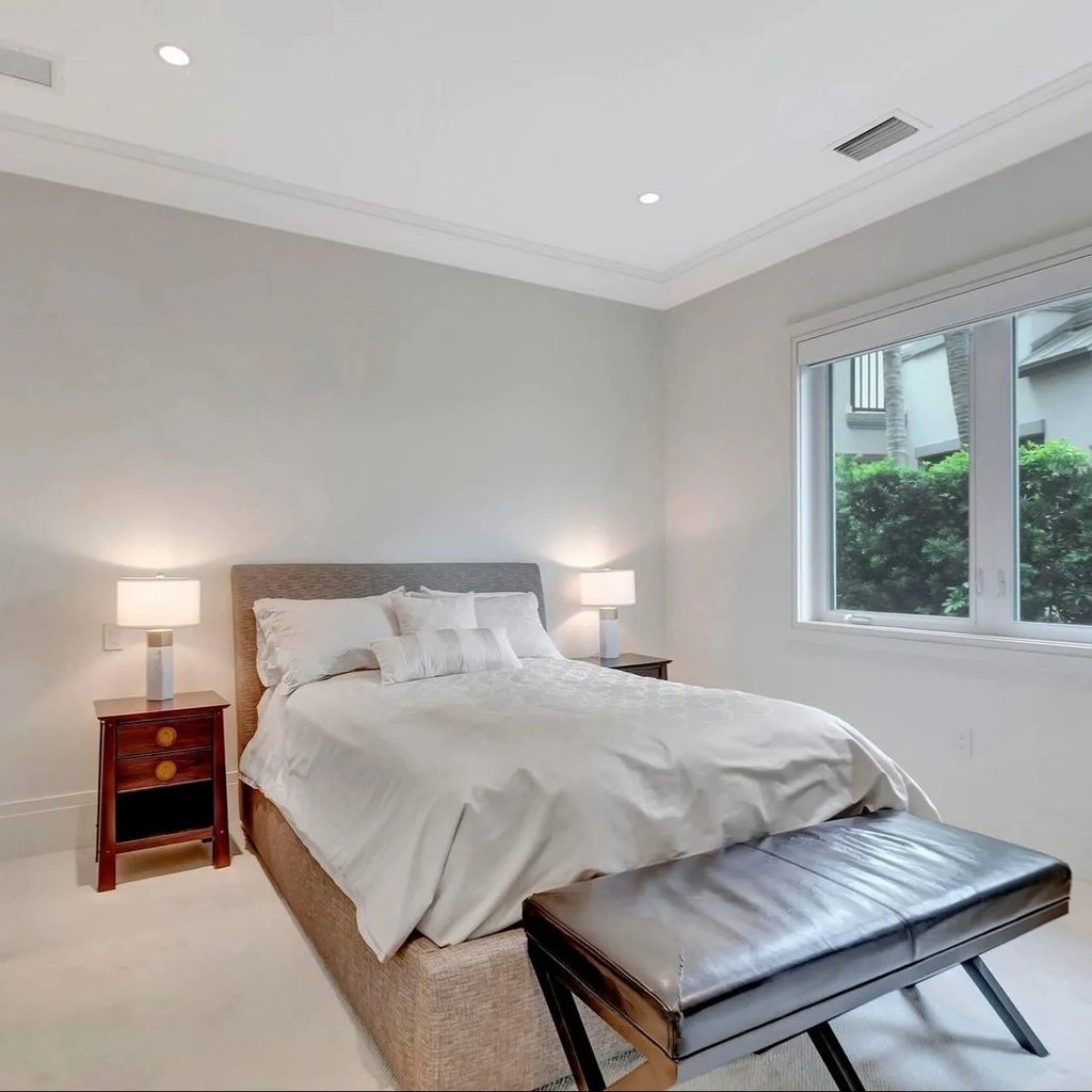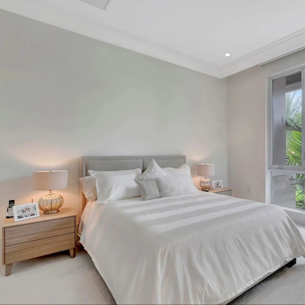 The primary suite exudes tranquility, with a private terrace, spa-like bathroom, and custom walk-in closet. Floor-to-ceiling windows invite in water views while blackout shades ensure restful nights. The en-suite bath includes a freestanding soaking tub, double vanities, and a glass-enclosed rainfall shower. Guest bedrooms mirror the same attention to detail, providing comfort, space, and privacy for visiting family and friends.