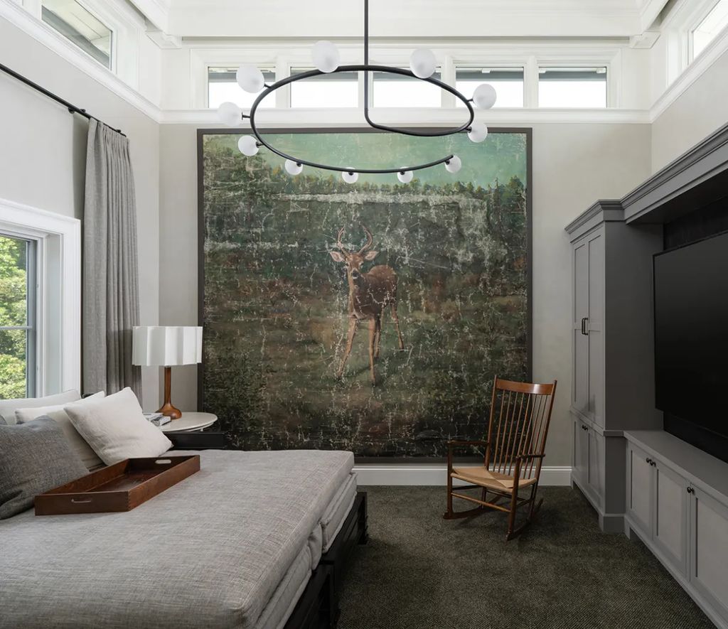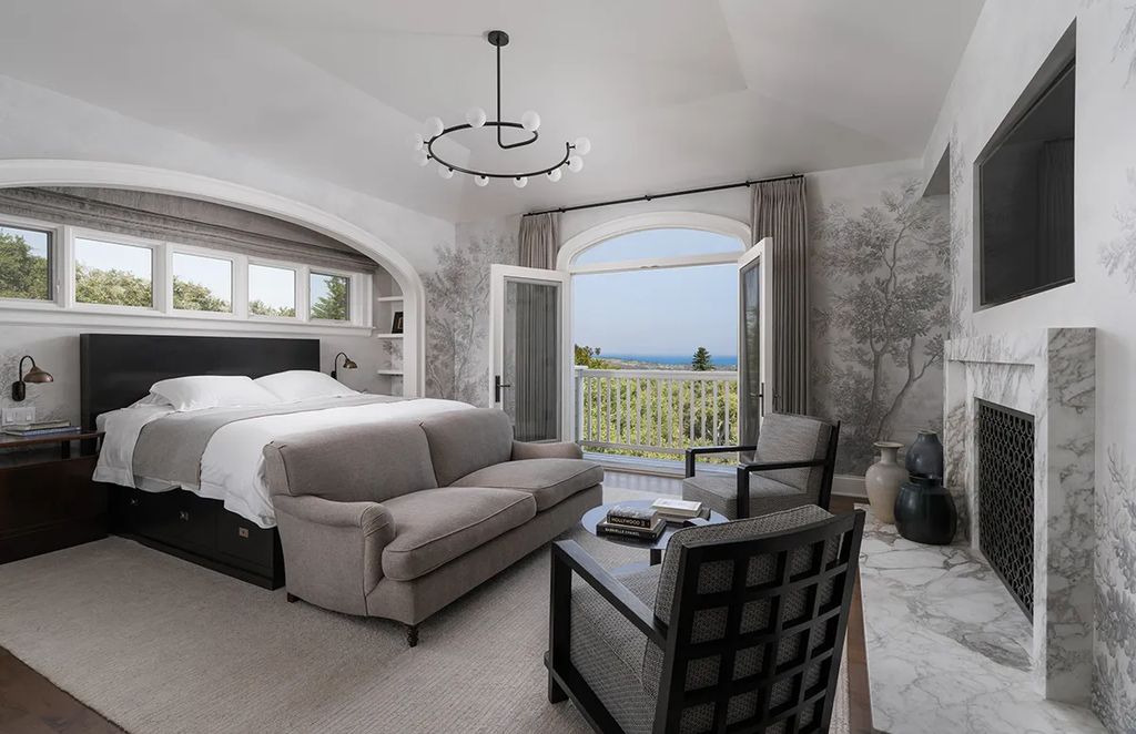 The estate’s primary suite is a private retreat, featuring a spacious bedroom, a cozy fireside seating area, and a balcony overlooking the manicured grounds. The suite also includes a walk-in closet and a bathroom with a floating vanity, soaking tub, and spa-like finishes.