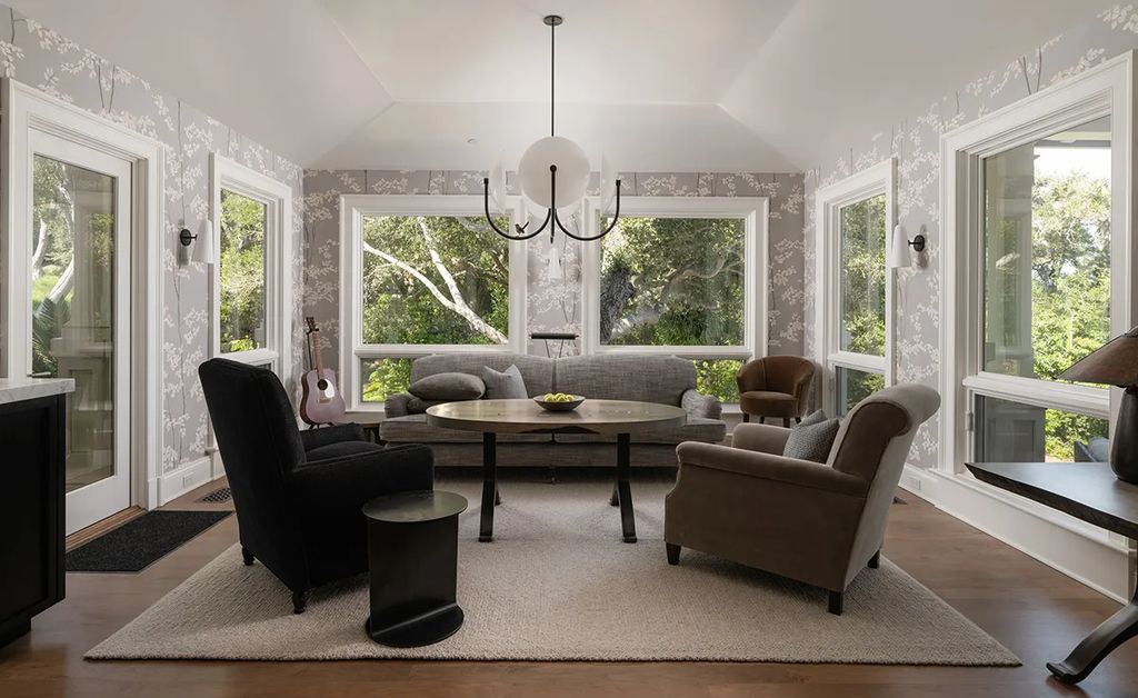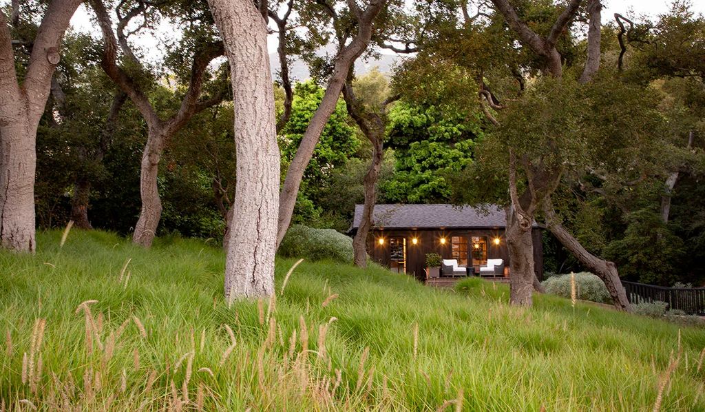 Guest accommodations include the garage-top suite (approximately 800 square feet) and a detached cabin (454 square feet), each with a private bedroom and bath. These spaces provide privacy and flexibility for visiting friends, extended family, or personal staff. According to Riskin Partners, “The additional structures were designed to complement the main home while preserving the estate’s overall harmony with the landscape,” a representative told californialuxuryhouses.