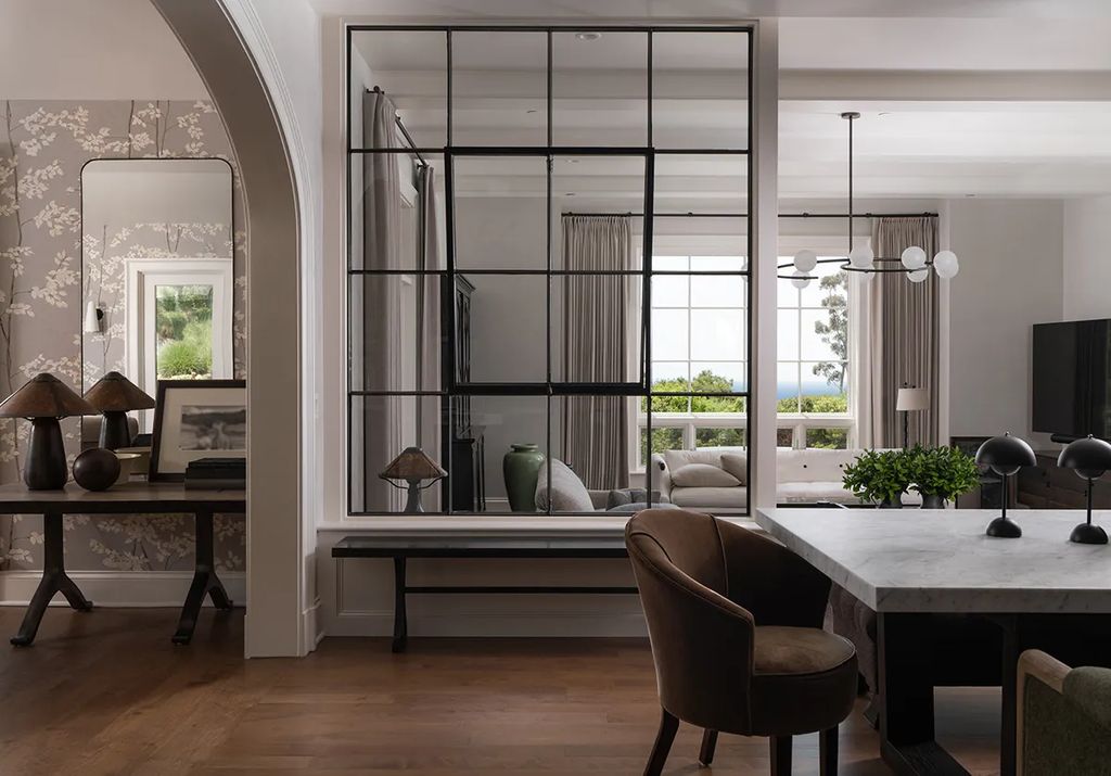 The main residence features 7,100 square feet of living space, with dark hardwood floors, lime-washed walls, and whitewashed wood-beam ceilings. The design blends classic California architecture with contemporary finishes, creating an atmosphere that is both elegant and inviting. Arched doorways, high ceilings, and large windows ensure abundant natural light throughout the home, enhancing the sense of openness and airiness.
