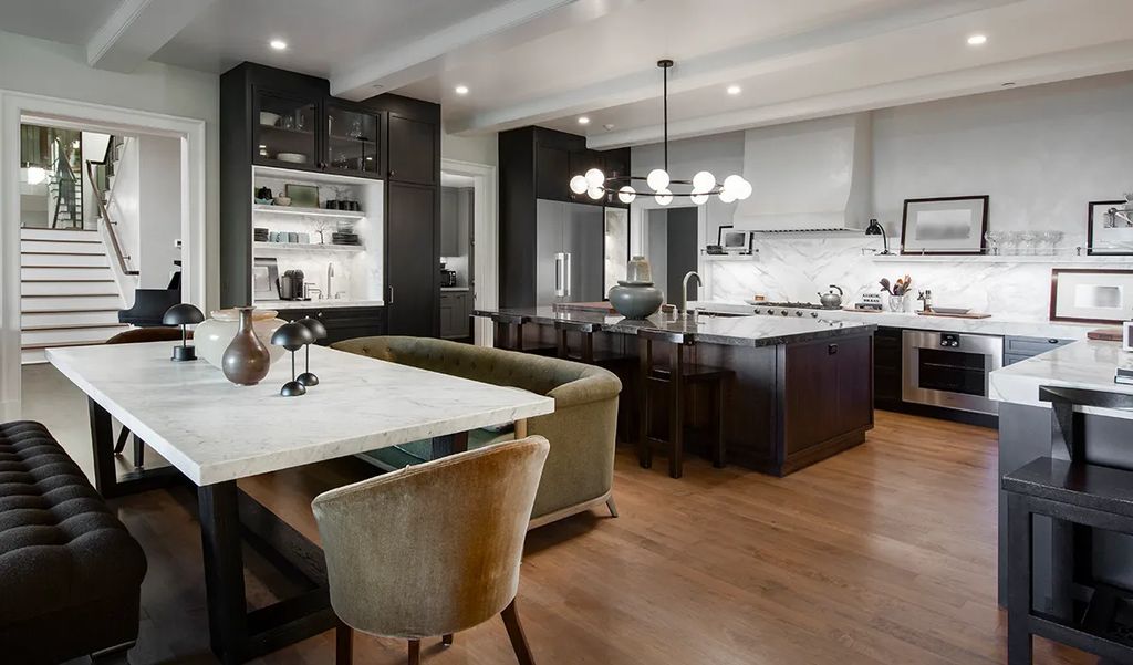 An elevator services all three floors, offering convenience without sacrificing style. Additional interior highlights include a media room, a sleeping porch, and a fireside living room anchored by a veined marble fireplace. The kitchen has been upgraded with marble countertops, a built-in coffee station, top-of-the-line appliances, a workstation, and a walk-in pantry, reflecting Ryan’s attention to both functionality and luxury.