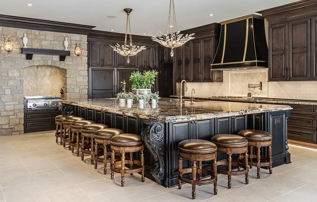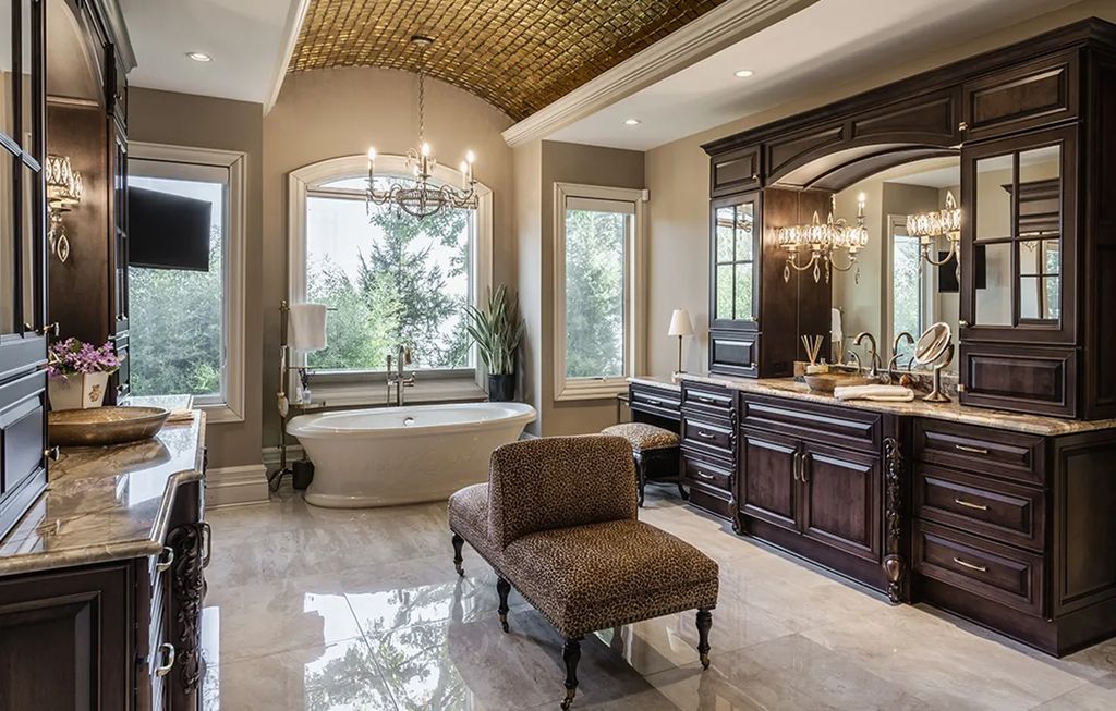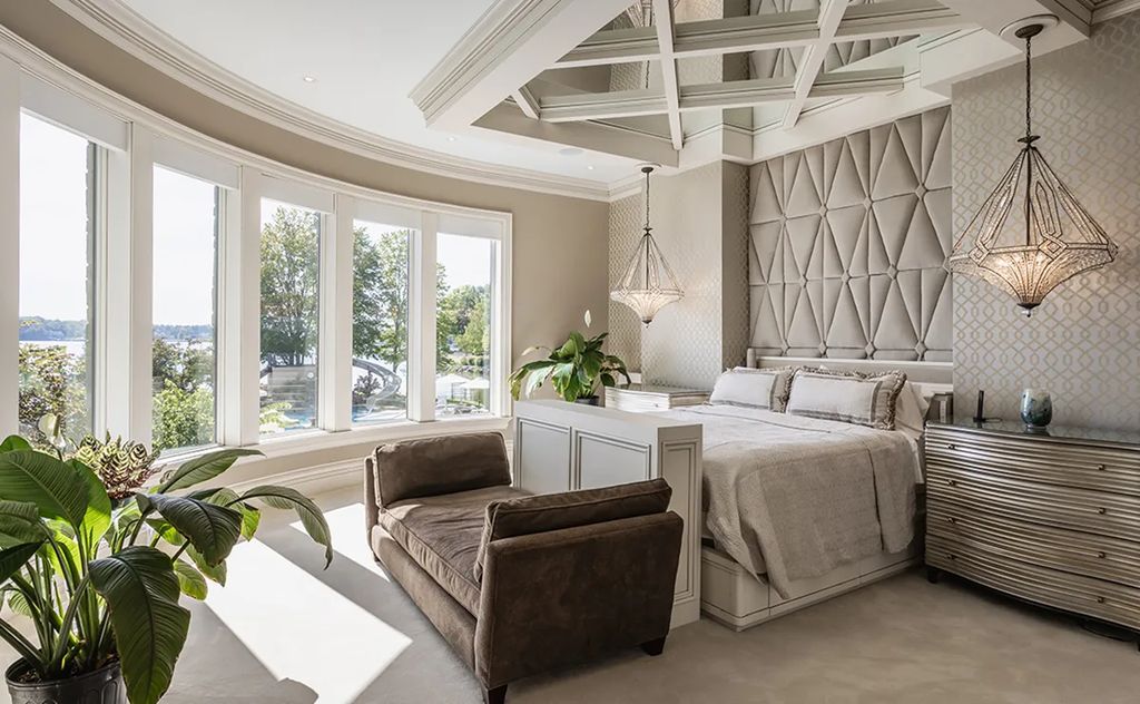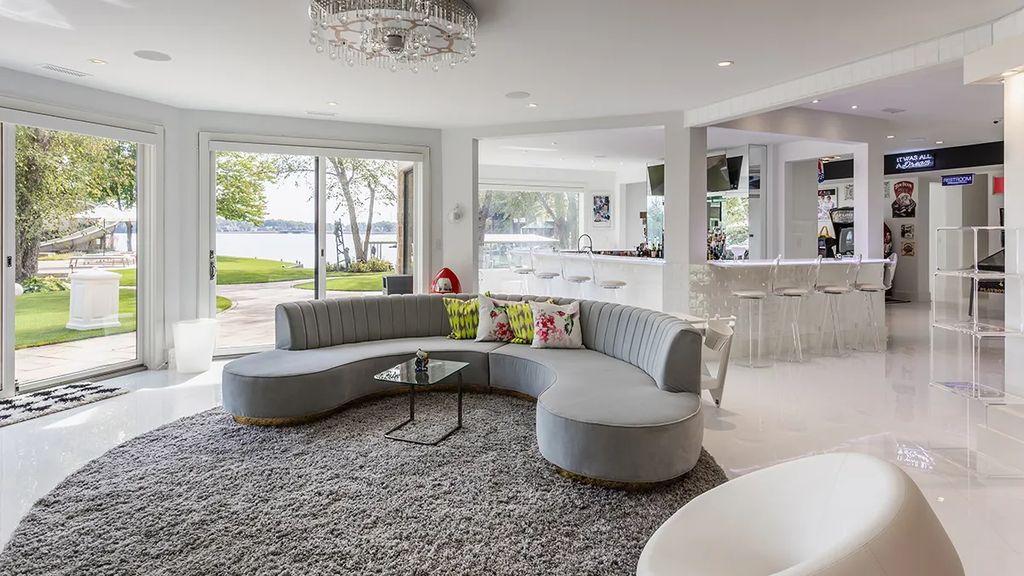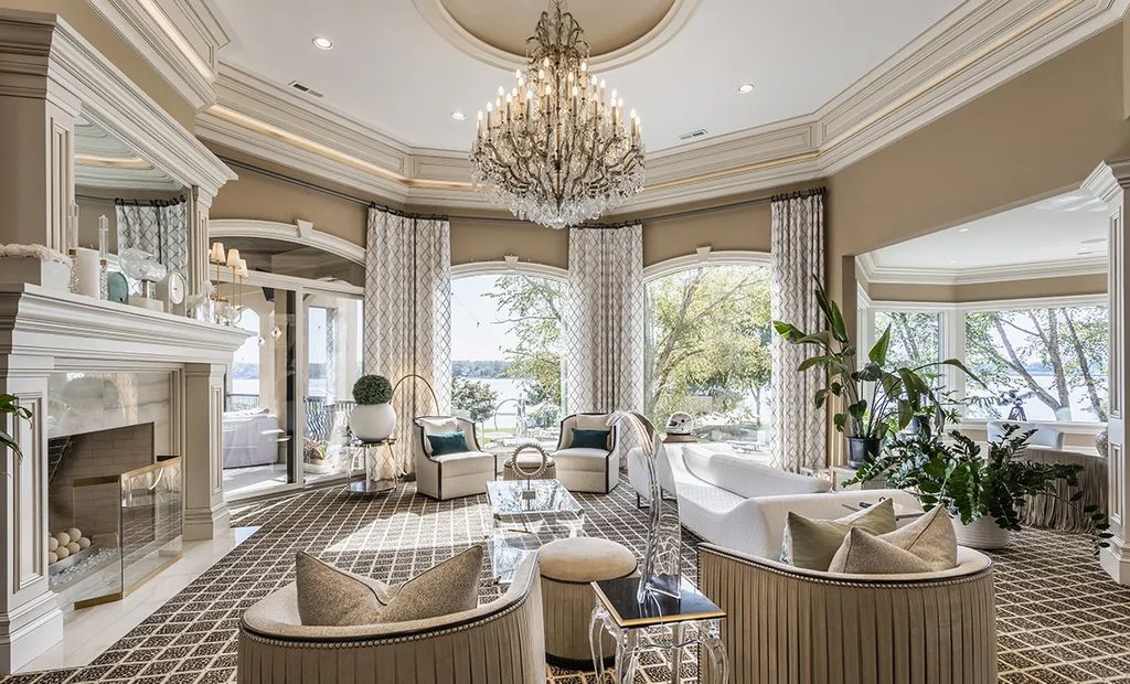 A turreted foyer opens to a cove-ceilinged living room with expansive glass walls overlooking the lake. The gourmet kitchen features a 14-foot island, Italian Ilve range, wine and grilling stations, and a caterer’s kitchen. A 20-foot retractable glass wall connects seamlessly to a lakeside veranda.